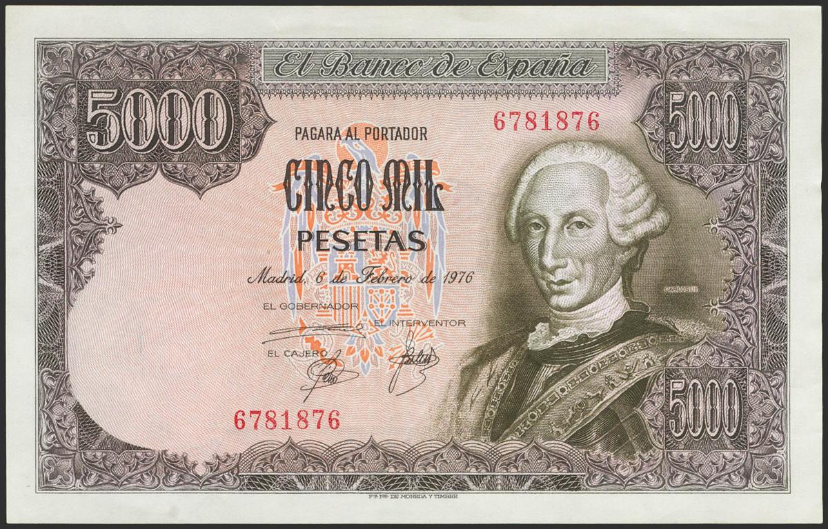 5000 Pesetas. February 6, 1976. Without series and capicua numbering. (Edifil 2021: 475). Original sizing. Almost Uncirculated-.