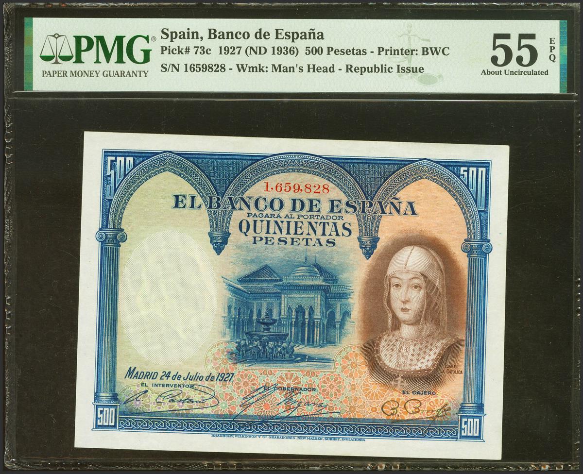 500 Pesetas. July 24, 1927. Without series and numbering after 1602000. (Edifil 2021: 352, Pick: 73c). Unusual in this quality, original sizing. Good Extremely Fine. PMG55EPQ package.