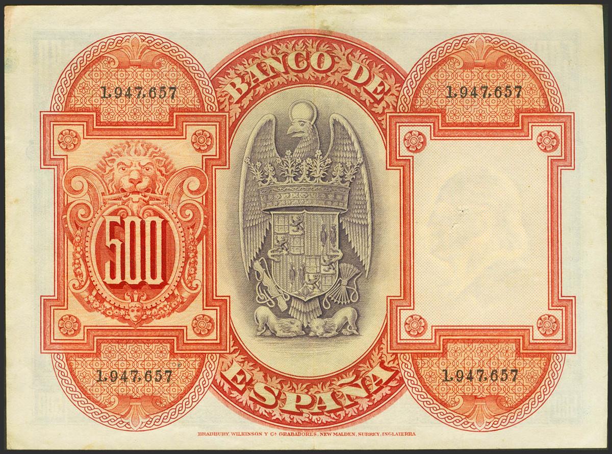 500 Pesetas. July 24, 1927. Without series and numbering after 1602000. (Edifil 2021: 352). It retains some of its original finish and staple points. Almost Extremely Fine.