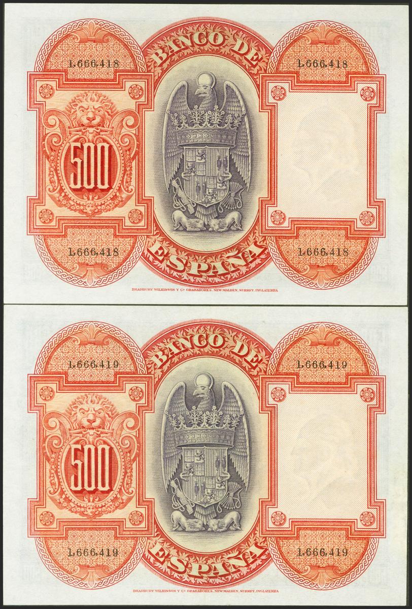 500 Pesetas. July 24, 1927. Correlative couple. Without series and after 1602000. (Edifil 2021: 352). Unusual, one of them small repair on the left margin. Extremely Fine.