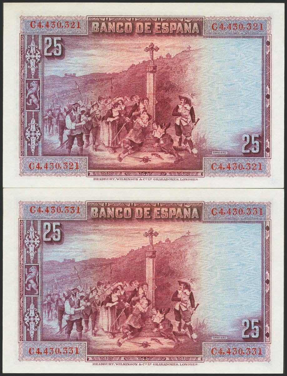 25 Pesetas. August 15, 1928. Correlative couple. Series C. (Edifil 2021: 353). Original sizing. Almost Uncirculated.