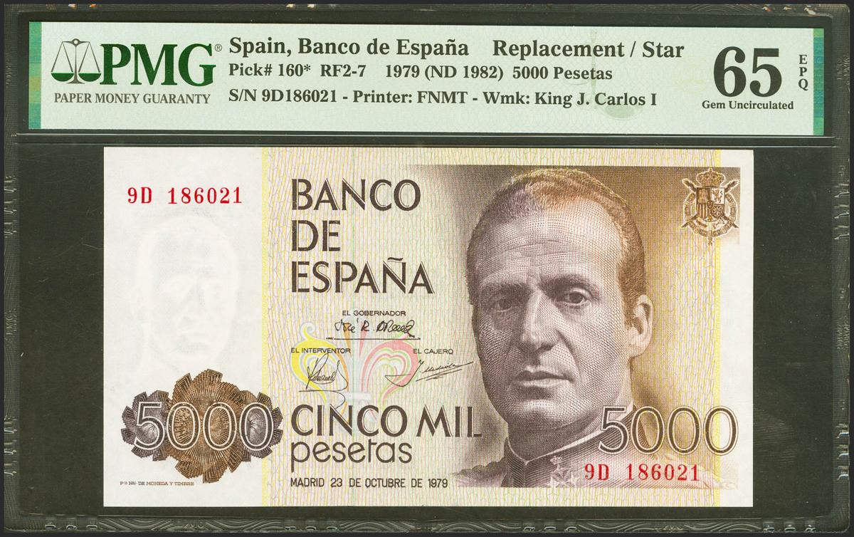 5000 Pesetas. October 23, 1979. Special series 9D. (Edifil 2021: 478b, Pick: 160*). Rare in this exceptional quality. Uncirculated. PMG65EPQ package.