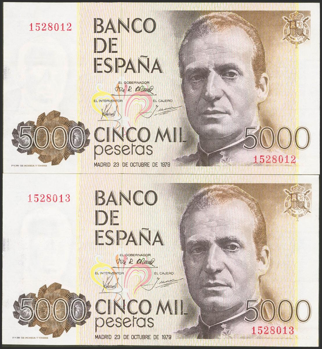 5000 Pesetas. October 23, 1979. Correlative couple. No serie. (Edifil 2021: 478) Natural undulations from the manufacturing process (this is the only reason for "removing" the Uncirculated). EBC+++.