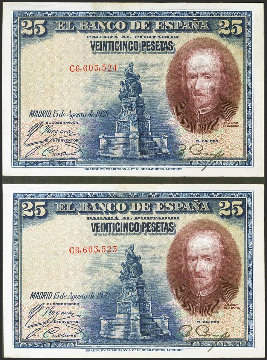 25 Pesetas. August 15, 1928. Correlative couple. Series C. (Edifil 2021: 353). Original sizing. Good Extremely Fine.