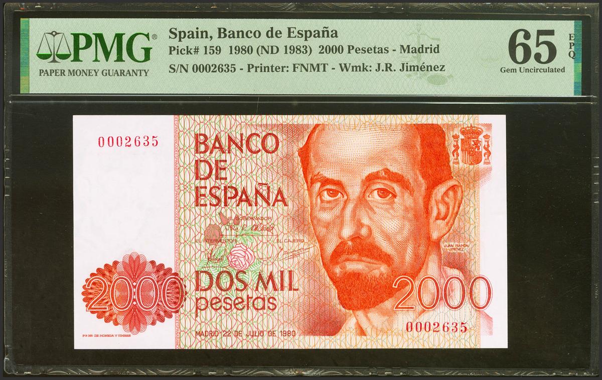 English 2000 Pesetas. July 22, 1980. Without series and very low numbering. (Edifil 2021: 479, Pick: 159). Uncirculated. PMG65PQ package.