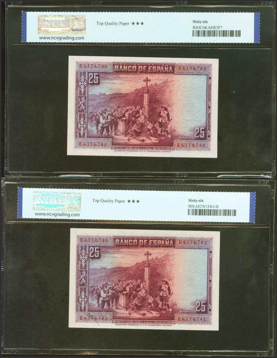 English 25 Pesetas. August 15, 1928. Correlative couple. Series E. (Edifil 2021: 353, Pick: 74b). Original sizing. Uncirculated. NCV66TQP packages, both.