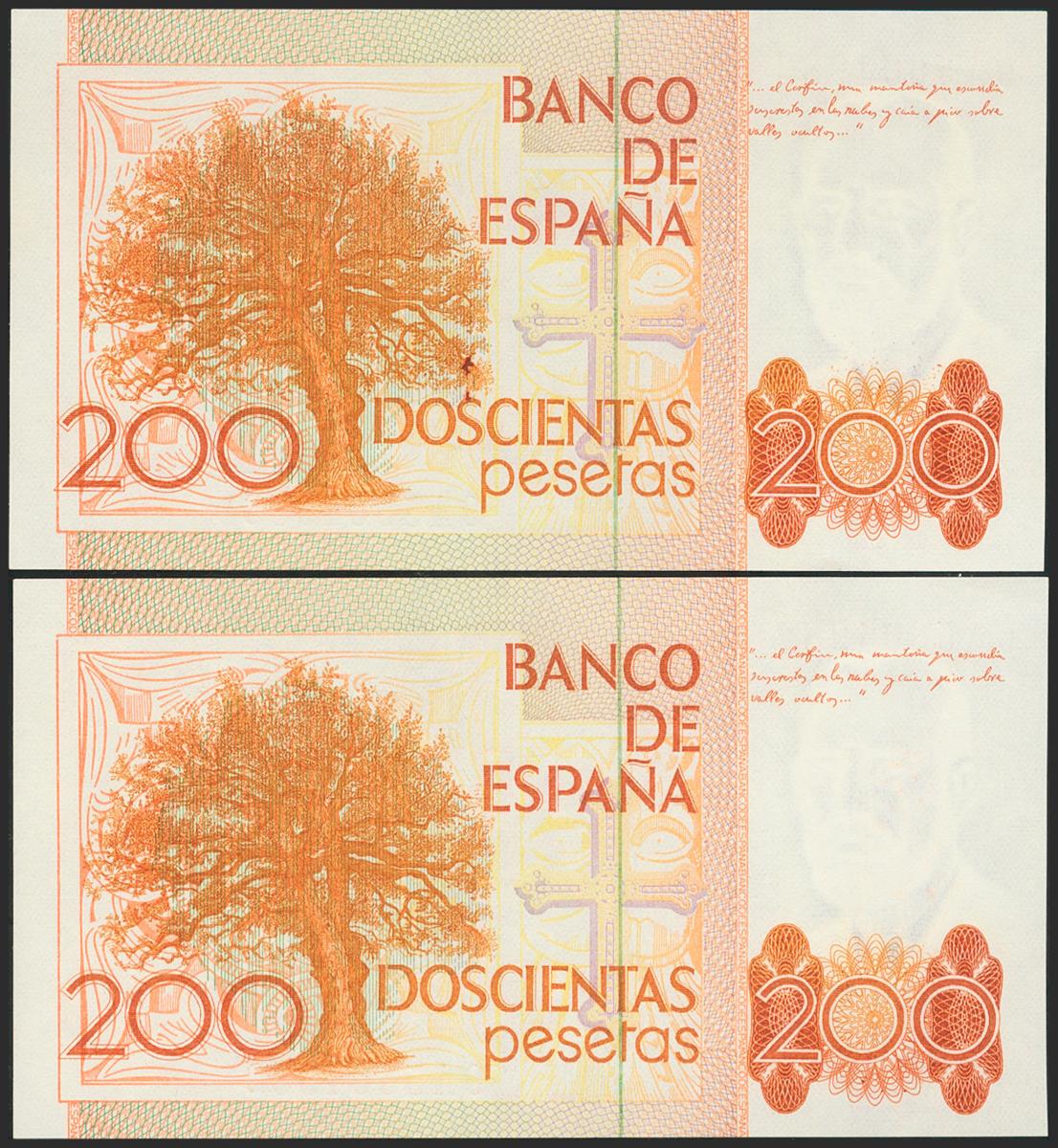 200 Pesetas. September 16, 1980. Correlative couple. Special series 9A. (Edifil 2021: 480b). Uncirculated.