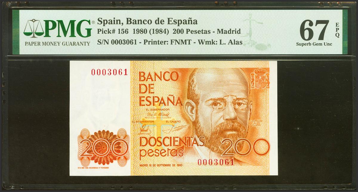 English 200 Pesetas. September 16, 1980. Without series and very low numbering. (Edifil 2021: 480, Pick: 156). Rare in this exceptional quality. Uncirculated. PMG67EPQ package.