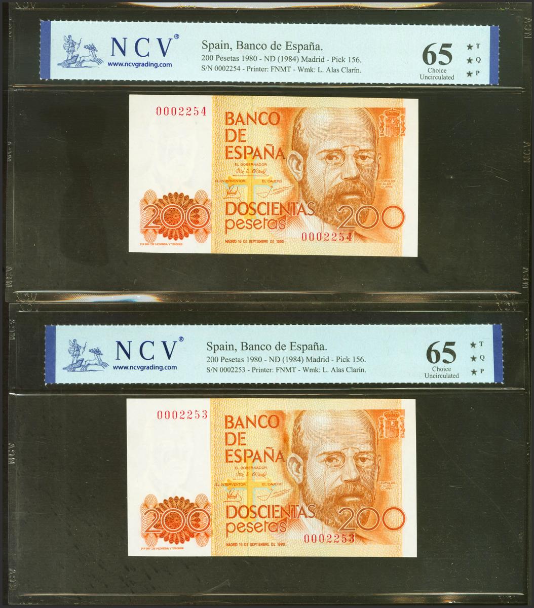 200 Pesetas. September 16, 1980. Correlative couple. No series and very low numbering. (Edifil 2021: 480, Pick: 156). Unusual in this exceptional quality. Uncirculated. NCV65TQP packages, both.