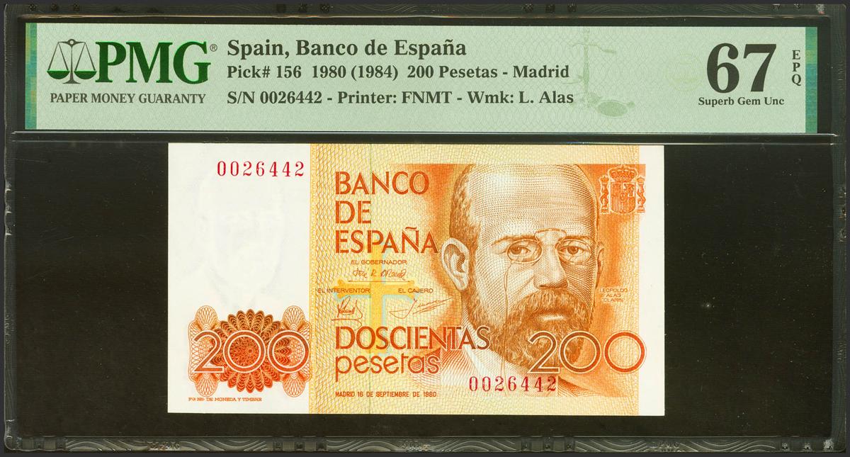 English 200 Pesetas. September 16, 1980. No series and low numbering. (Edifil 2021: 480, Pick: 156). Uncirculated. PMG67EPQ package.