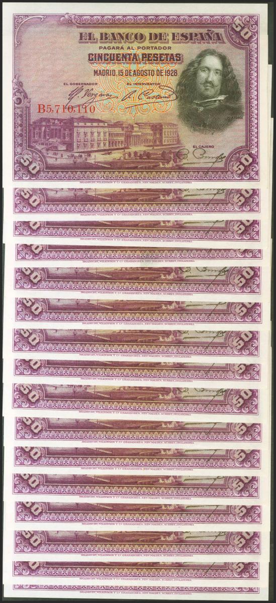 Set of 15 correlative 50 Pesetas banknotes issued on August 15, 1928 with series B, (Edifil 2021: 354), preserving part of its original size. Uncirculated/ Almost Uncirculated.