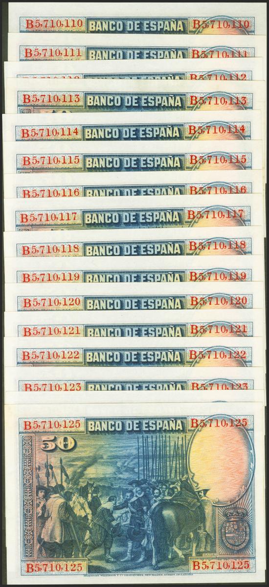 Set of 15 correlative 50 Pesetas banknotes issued on August 15, 1928 with series B, (Edifil 2021: 354), preserving part of its original size. Uncirculated/ Almost Uncirculated.