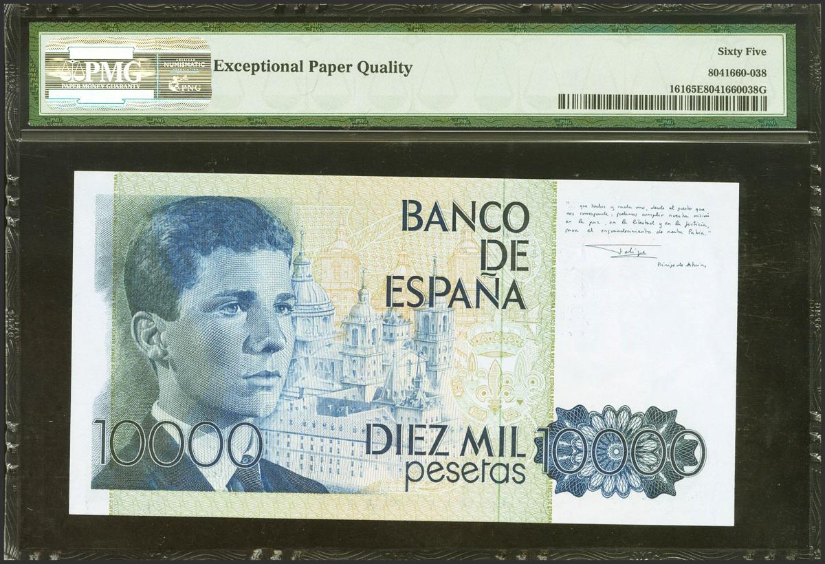 10,000 Pesetas. September 24, 1985. No series and very low numbering. (Edifil 2021: 481, Pick: 161). Unusual in this exceptional quality. Uncirculated. PMG65EPQ package.