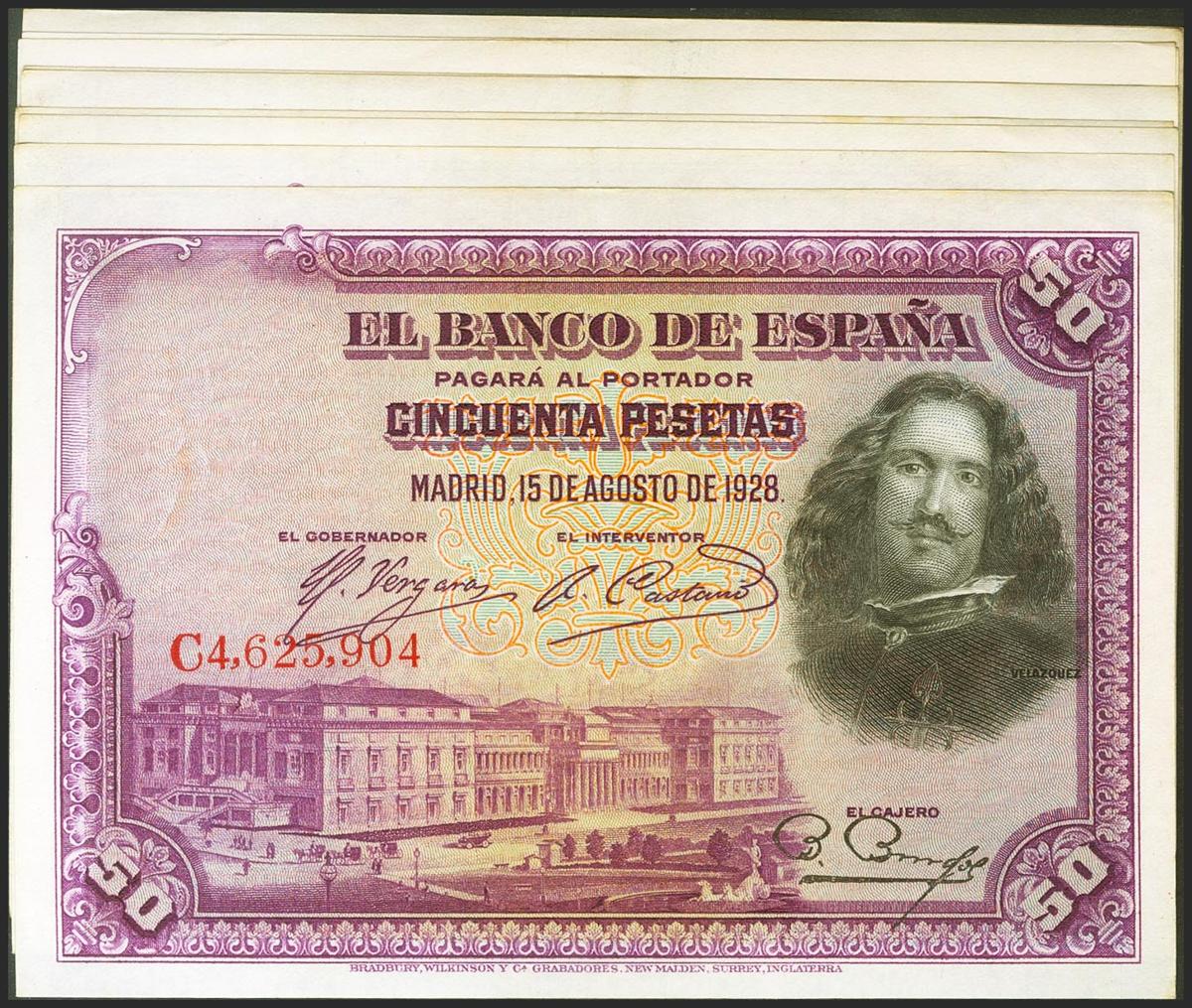 Set of 10 correlative banknotes and in different sections of 50 Pesetas issued on August 15, 1928 and with series C (Edifil 2021: 354), preserving most of the original size. Good Extremely Fine.