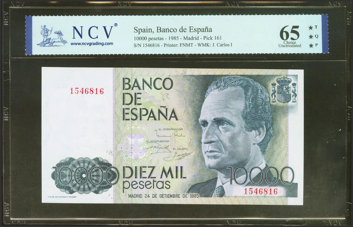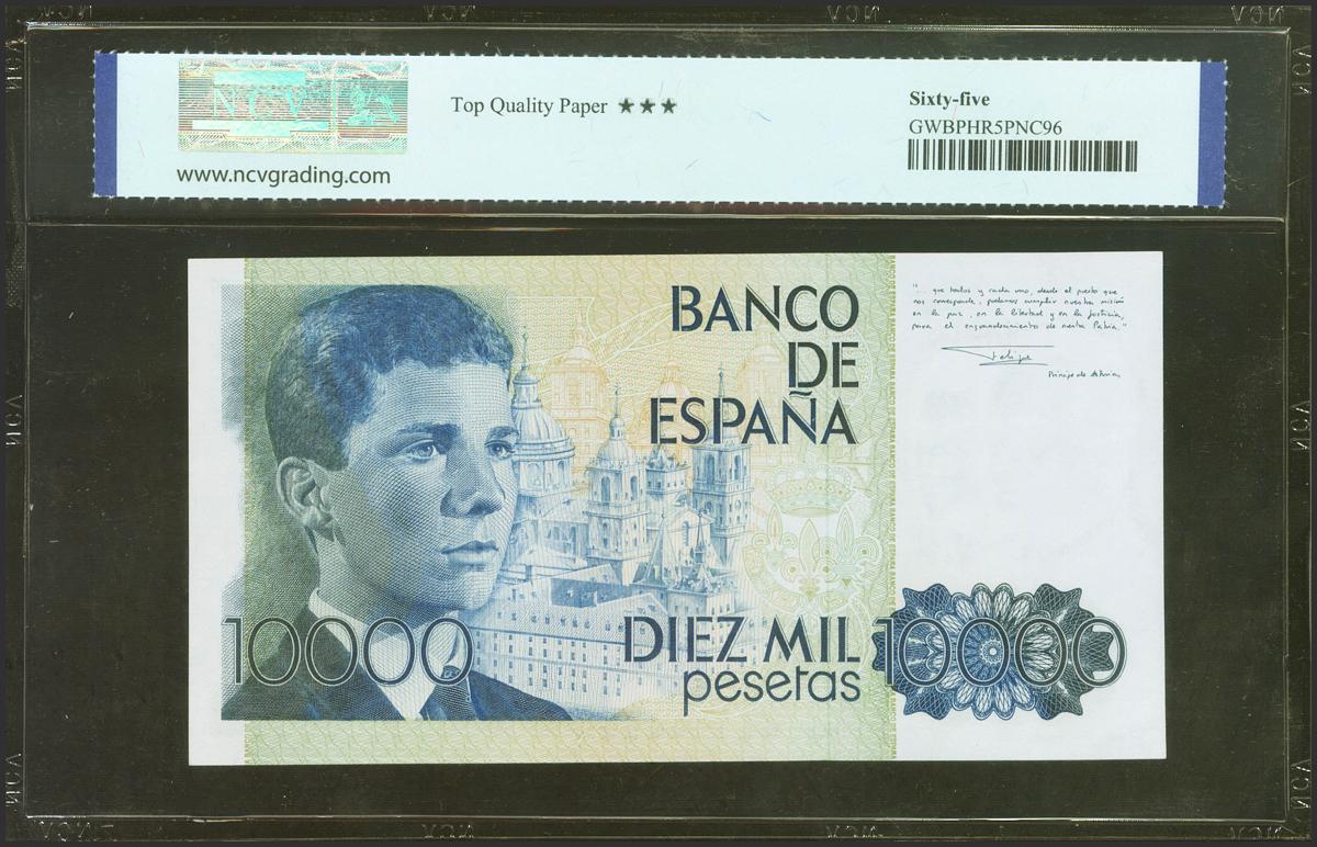 10,000 Pesetas. September 24, 1985. No series. (Edifil 2021: 481, Pick: 161). Unusual in this exceptional quality. Uncirculated. NCV65TQP package.