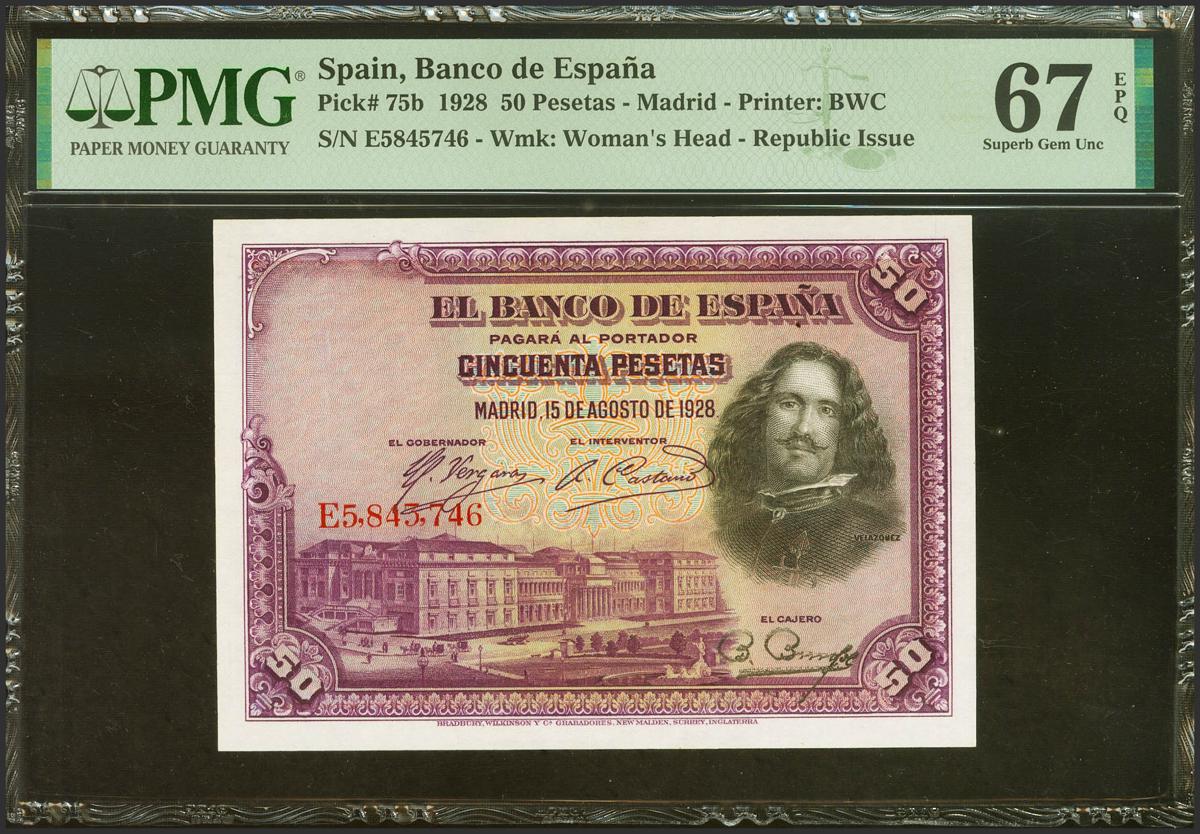 50 Pesetas. August 15, 1928. Series E, last series issued. (Edifil 2021: 354, Pick: 75b). Rare in this exceptional quality, original sizing. Uncirculated. PMG67EPQ package.