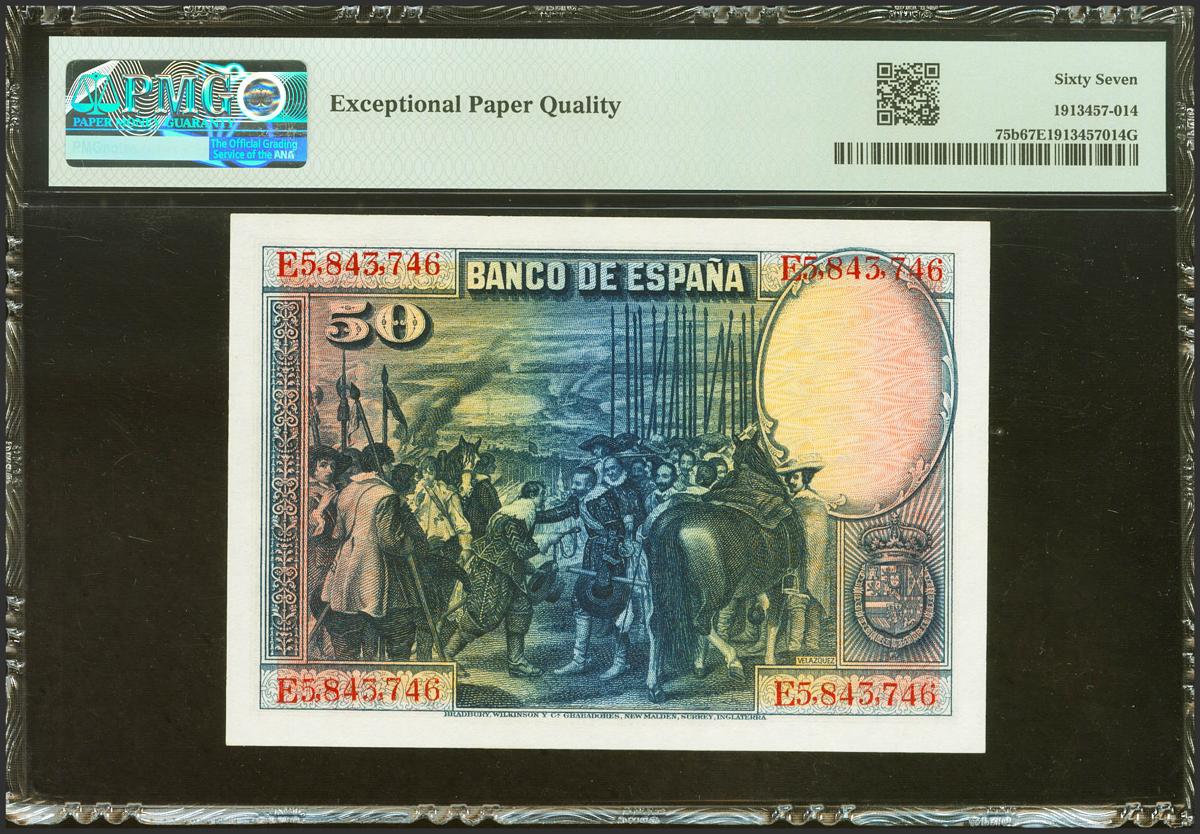 50 Pesetas. August 15, 1928. Series E, last series issued. (Edifil 2021: 354, Pick: 75b). Rare in this exceptional quality, original sizing. Uncirculated. PMG67EPQ package.