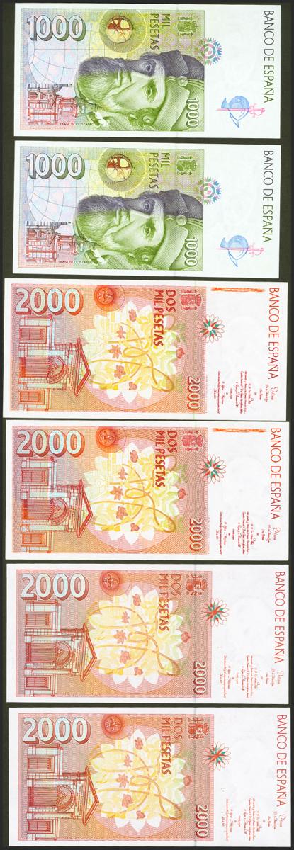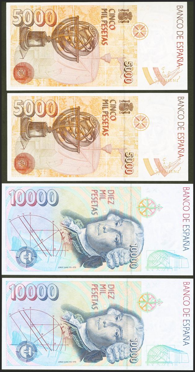 Complete series in correlative pairs of the 1000, 2000 (plus another one with the numbering 1S), 5000 and 10000 Pesetas banknotes issued in 1992 and all of them with the same serial number Nº008277 and 008278. (Edifil 2017: 482/85, 482A ). Rare set. Uncirculated.