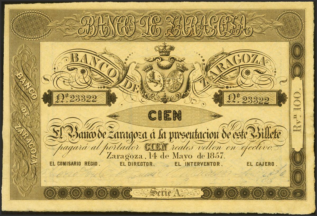 100 Reales. May 14, 1857. Bank of Zaragoza. Series A and without matrix. (Edifil 2021: 126B). Original sizing. Uncirculated.