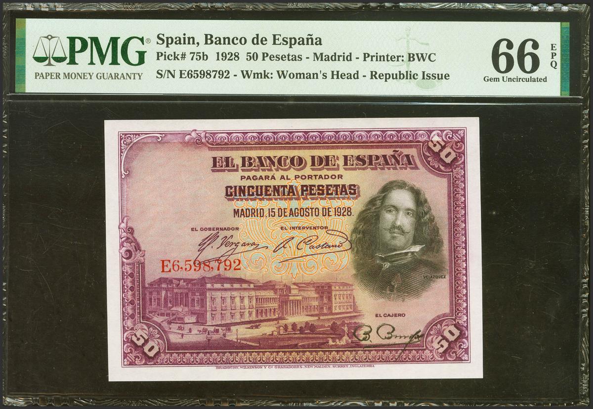 English 50 Pesetas. August 15, 1928. Series E, last series issued. (Edifil 2021: 354, Pick: 75b). Unusual in this exceptional quality, original sizing. Uncirculated. PMG66EPQ package.
