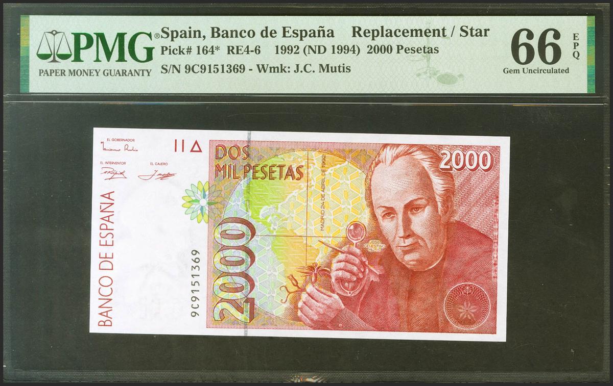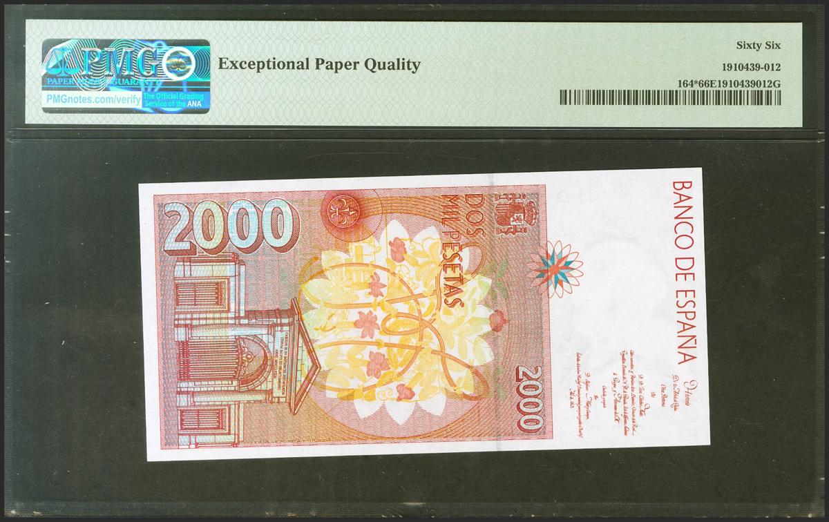 2000 Pesetas. April 24, 1992. Special series 9C. (Edifil 2021: 482Ab, Pick: 164*). Rare in this exceptional quality, original sizing. Uncirculated. PMG66EPQ package.