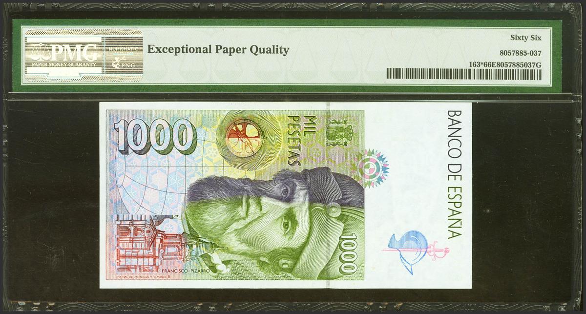 1000 Pesetas. October 12, 1992. Special series 9A. (Edifil 2021: 483c, Pick: 163*). Unusual in this exceptional quality. Uncirculated. PMG66EPQ package.