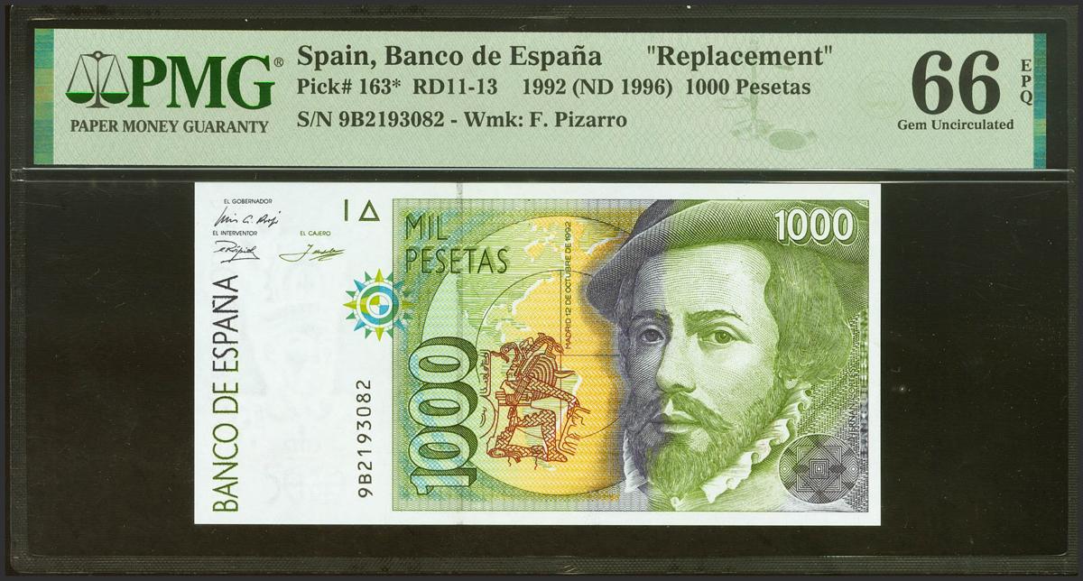 1000 Pesetas. October 12, 1992. Special series 9B. (Edifil 2021: 483c, Pick: 163*). Rare in this exceptional quality. Uncirculated. PMG66EPQ package.