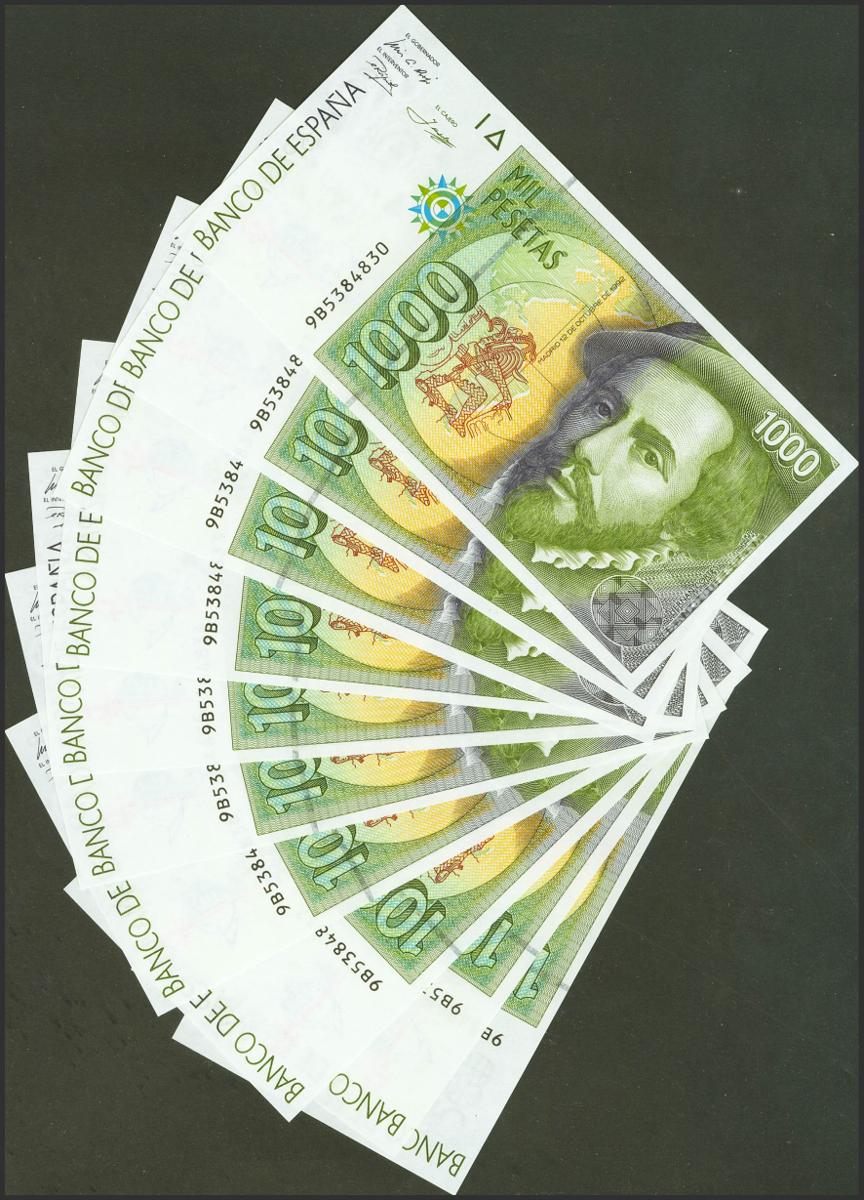 English Set of 10 consecutive 1000 Pesetas banknotes issued on October 12, 1992, all of them special series 9B (Edifil 2021: 483d). With natural undulations from the manufacturing process (this is the only reason for "removing" the Uncirculated). EBC+++.