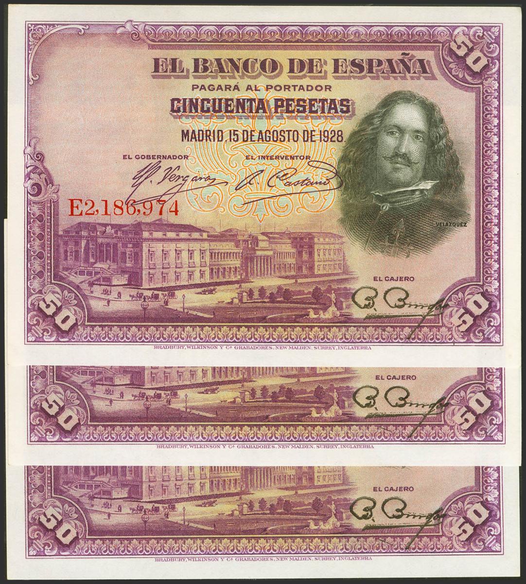 50 Pesetas. August 15, 1928. Correlative trio. Series E. (Edifil 2017: 354). It retains all its original finish. Almost Uncirculated.