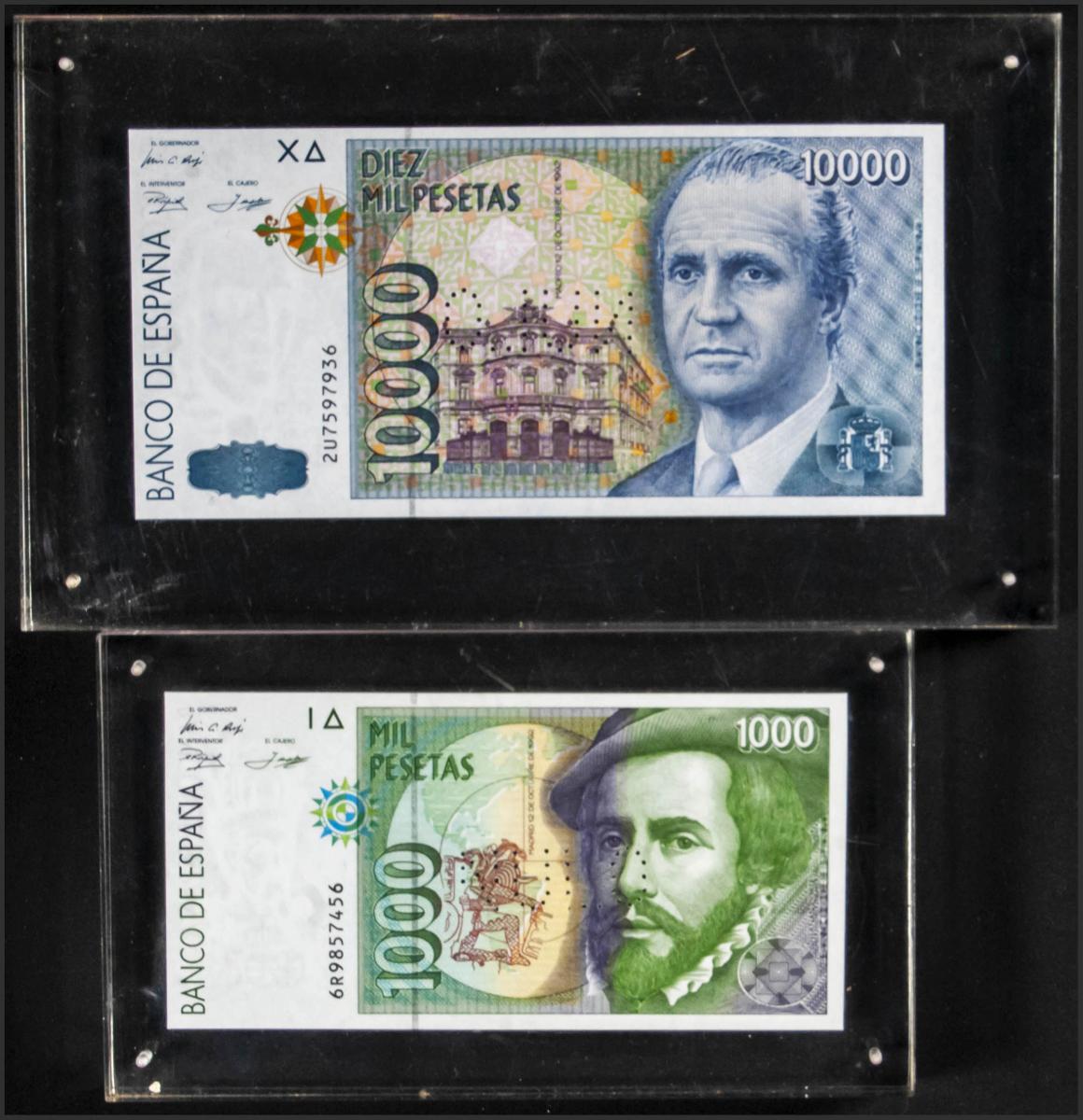 English Set of 2 banknotes of 1000 Pesetas and 10000 Pesetas from the issue of October 12, 1992, with the series 6R and 2U, respectively and presented in an official FNMT methacrylate case that cancels the banknotes with the NULL drill (Edifil 2022 : 483b, 485a). Unusual. Uncirculated.