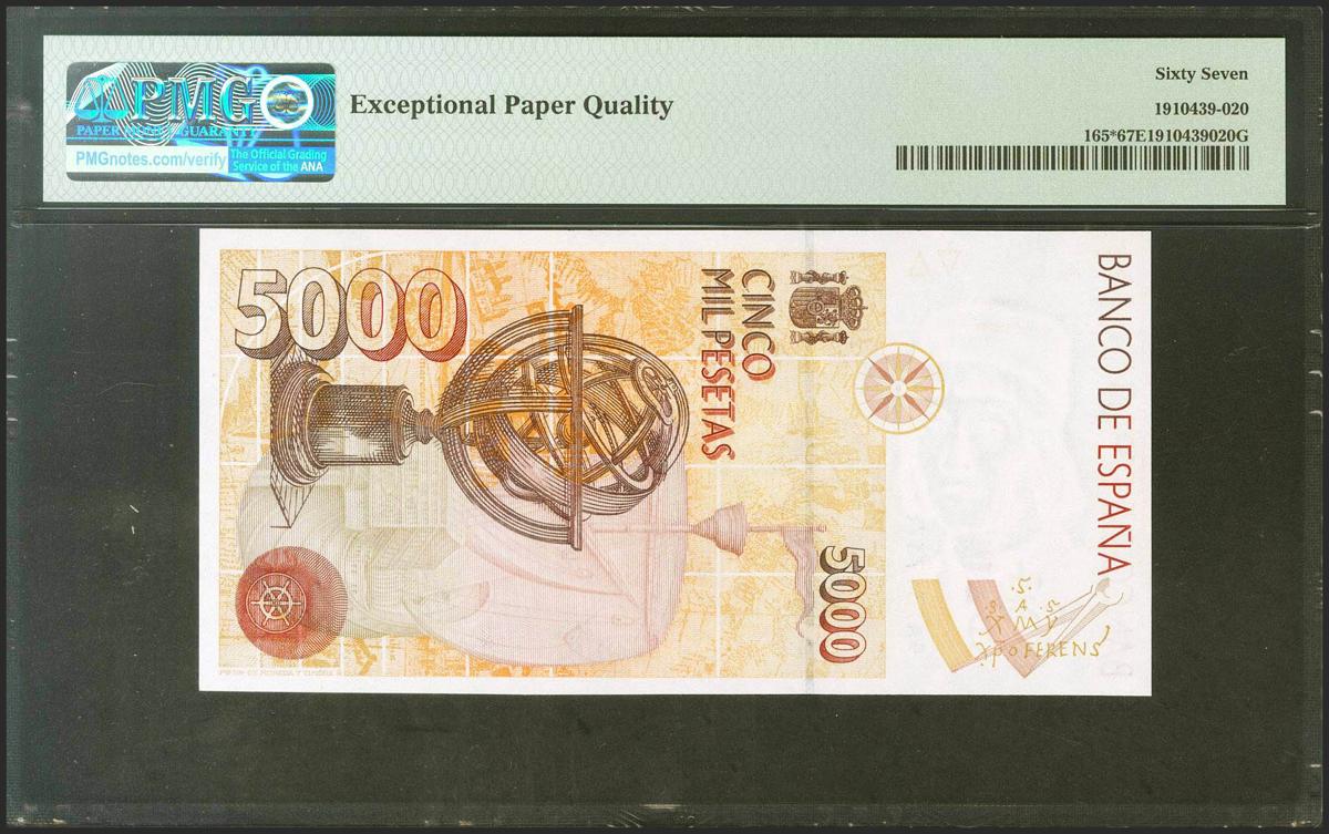 5000 Pesetas. October 12, 1992. Special series 9A. (Edifil 2021: 484b, Pick: 165*). Rare in this exceptional quality, original sizing. Uncirculated. PMG67EPQ package