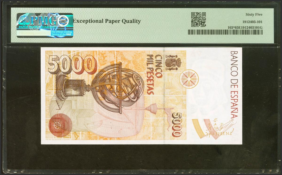 5000 Pesetas. October 12, 1992. Special series 9A. (Edifil 2021: 484b, Pick: 165*). Rare in this exceptional quality. Uncirculated. PMG65EPQ package.