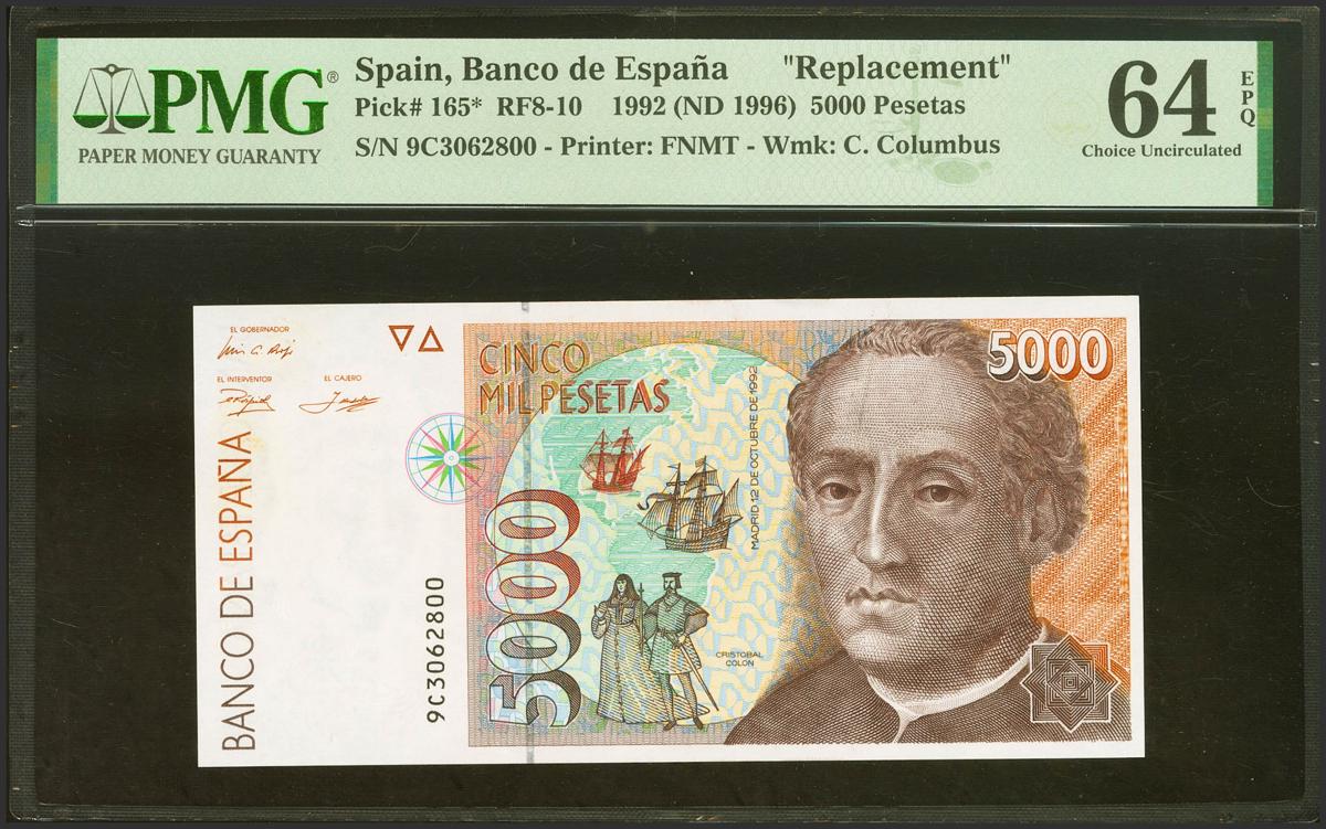 5000 Pesetas. October 12, 1992. Special series 9C. (Edifil 2021: 484b, Pick: 165*). Uncirculated. PMG64EPQ package.