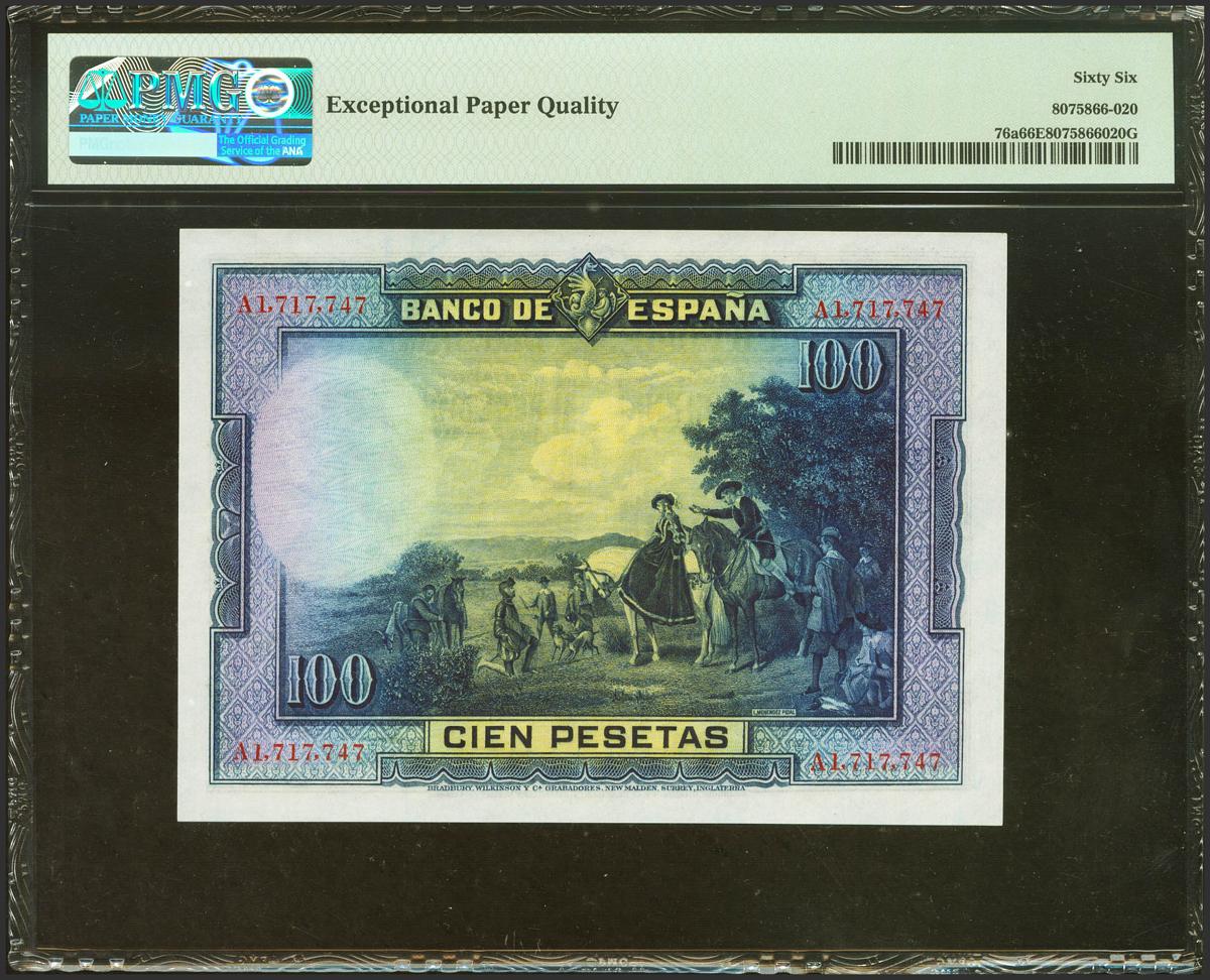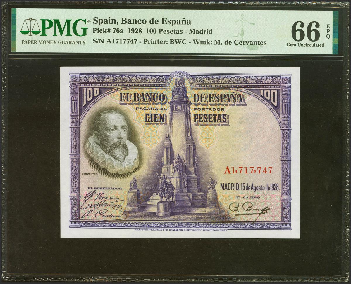 100 Pesetas. August 15, 1928. Series A. (Edifil 2021: 355a, Pick: 76a). Rare in this exceptional quality, original sizing. Uncirculated. PMG66EPQ package.