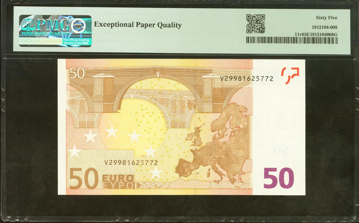 50 euros. January 1, 2002. Signature Trichet. Series V (Spain). (Edifil 2021: 489A, Pick: 11v). Uncirculated. PMG65EPQ package.