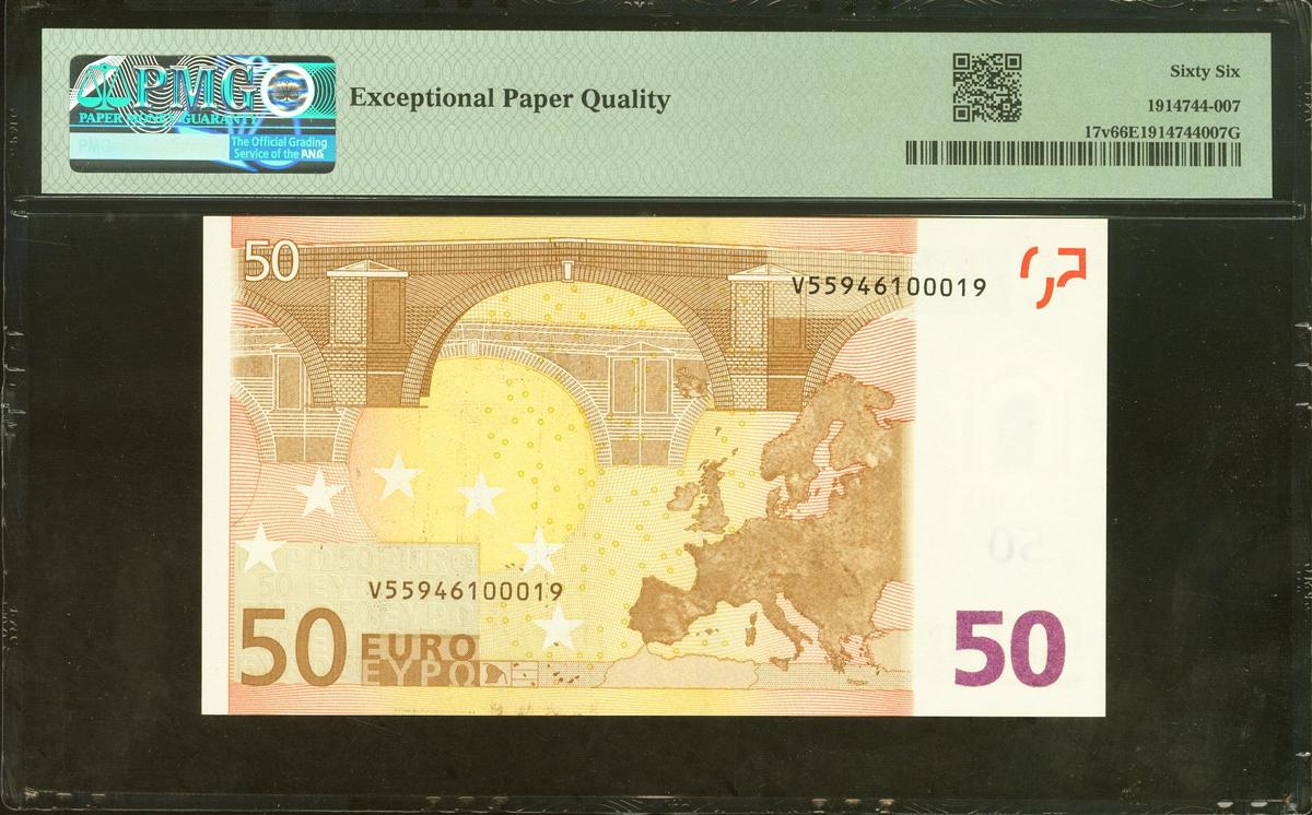 50 euros. January 1, 2002. Signature Draghi. Series V (Spain). (Edifil 2021: 489B, Pick: 17v). Uncirculated. PMG66EPQ package.