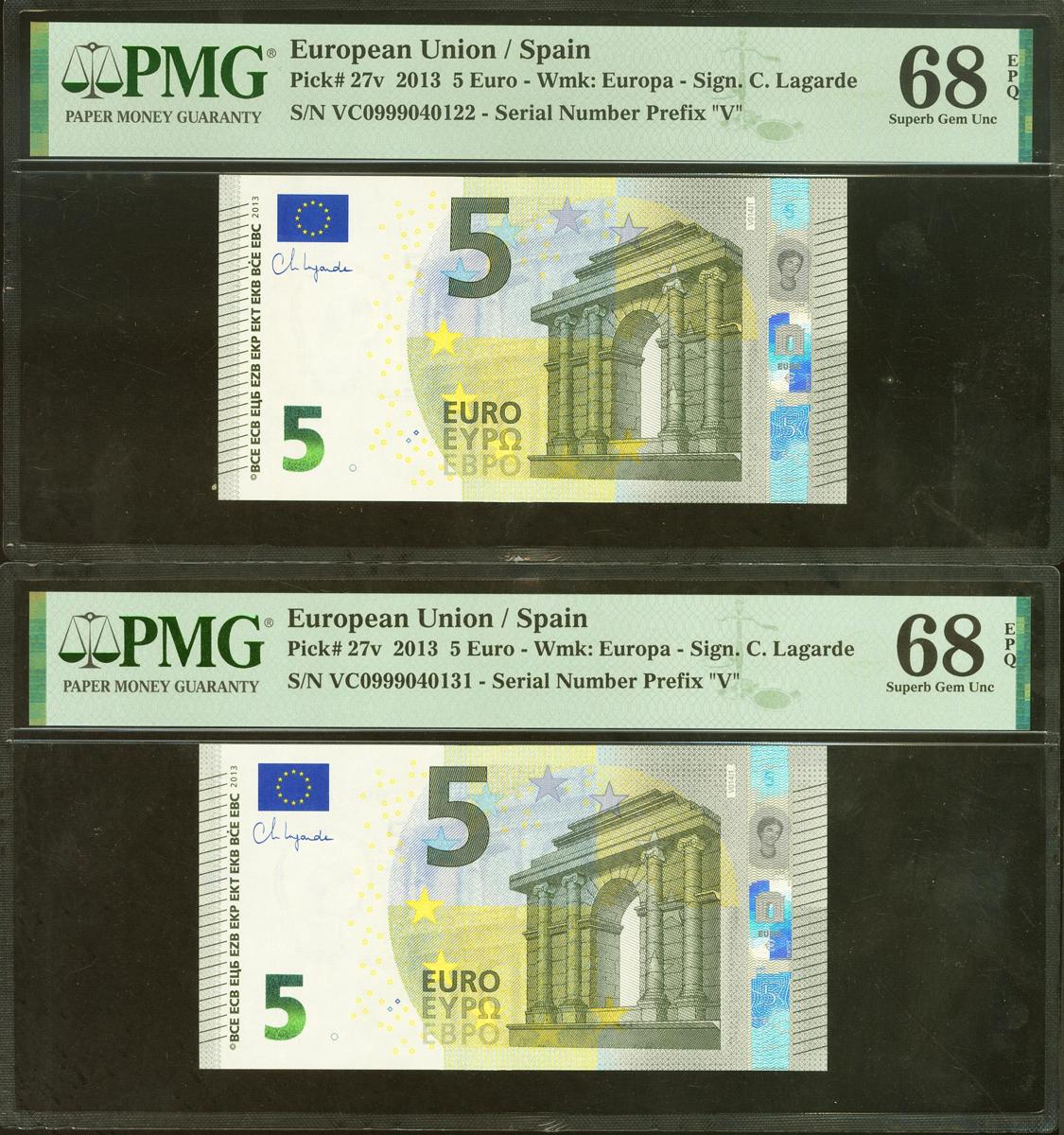 English 5 euros. May 2, 2013. Correlative pair (it should be remembered that the last digit of the numbering of all euro-denominated banknotes is for the internal control of the European Central Bank, which marks the correlativity of the banknotes is the penultimate digit). Series V (Spain). Lagarde signature. (Edifil 2021: 493, Pick: 27v). Uncirculated. PMG68EPQ package.