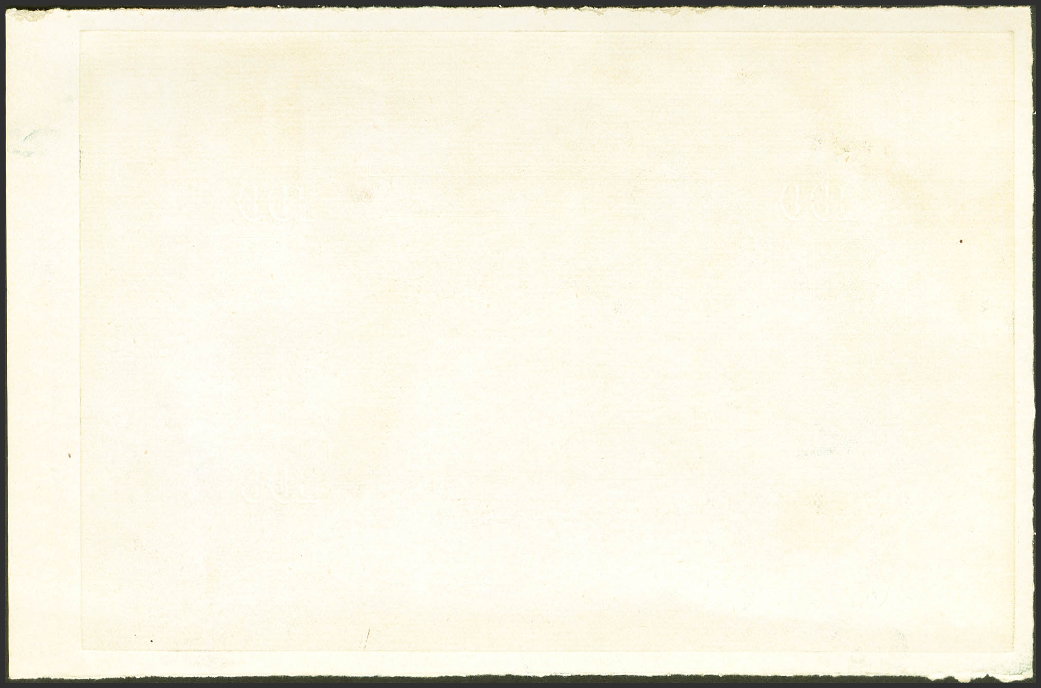 Proof of the reverse of the 100 Pesetas bill issued on April 7, 1953, in a non-definitive color and without numbering. (Edifil 2021: 464P). Extraordinarily rare. Uncirculated. The issuance of the banknote dedicated to the painter Julio Romero de Torres was a notable turning point in the production of the National Mint and Stamp Factory, both due to the changes in the processes derived from the new physical location of the factory and its new inherited machines. by Goya Engravings, as well as the formal beginning of the definitive standardization of colors that would take root during the rest of the 20th century. Coincidentally, this bill is also one about which the Casa de la Moneda Museum keeps the most information and examples. The original photos used, the engraved plates and their printing tests, among other things, are preserved (exclusive and unpublished images of these objects can be seen in the Encyclopedia of Notafilia and Spanish Scripophilia). But there are also intermediate developments, collages of borders, photos and drawn parts in approximations to the final design. It is at this point where the specimen offered at auction fits in, a unique piece coming from that creative process. We find an impression of the practically definitive design in the absence of the texts on the cartouches. You can precisely see, hand-drawn, the text BANCO DE ESPAÑA in the final typography. At the bottom the text CIEN PESETAS does not yet appear. We also found a subtle difference in the white lines in the guilloche design on the left and top, although this is possibly a matter of the perfection of the iron used in this test. In short, we find an exceptional and unique piece worthy of a museum, which in fact complements the collections of the FNMT.