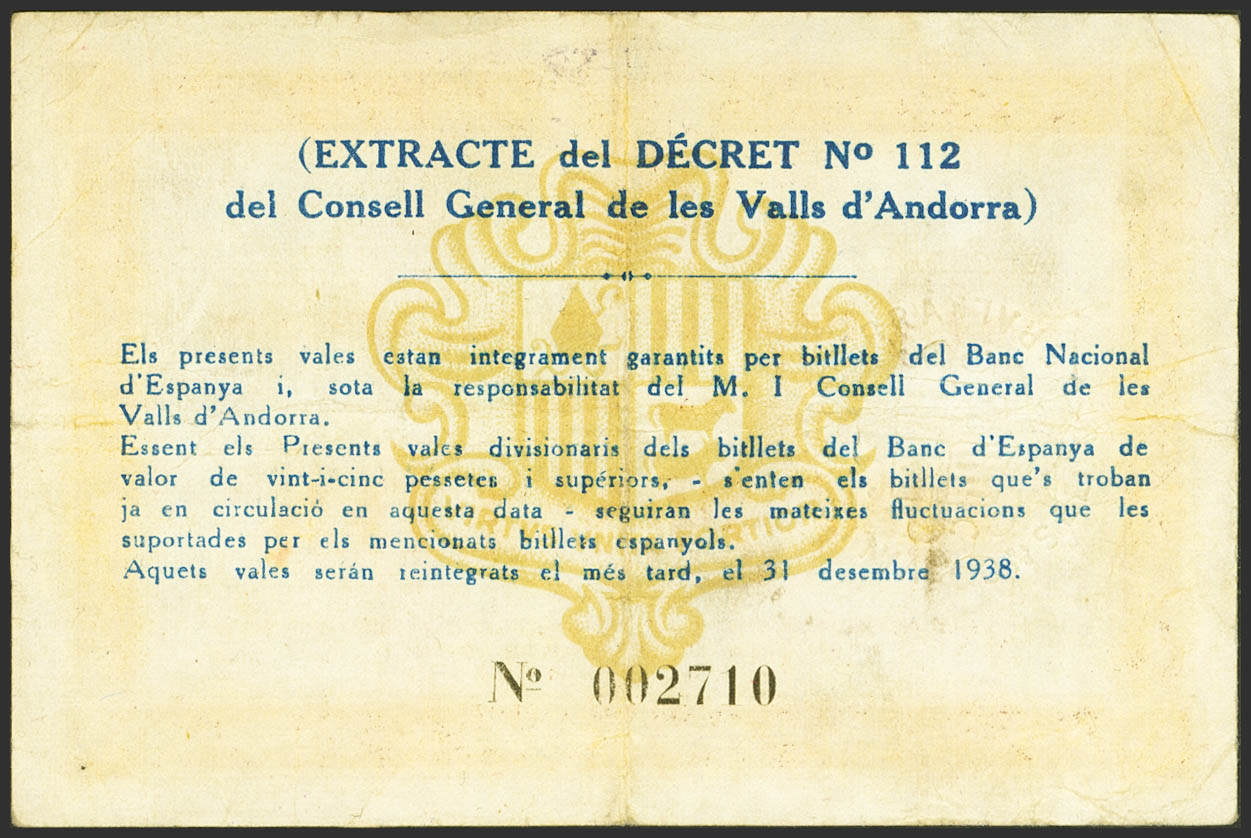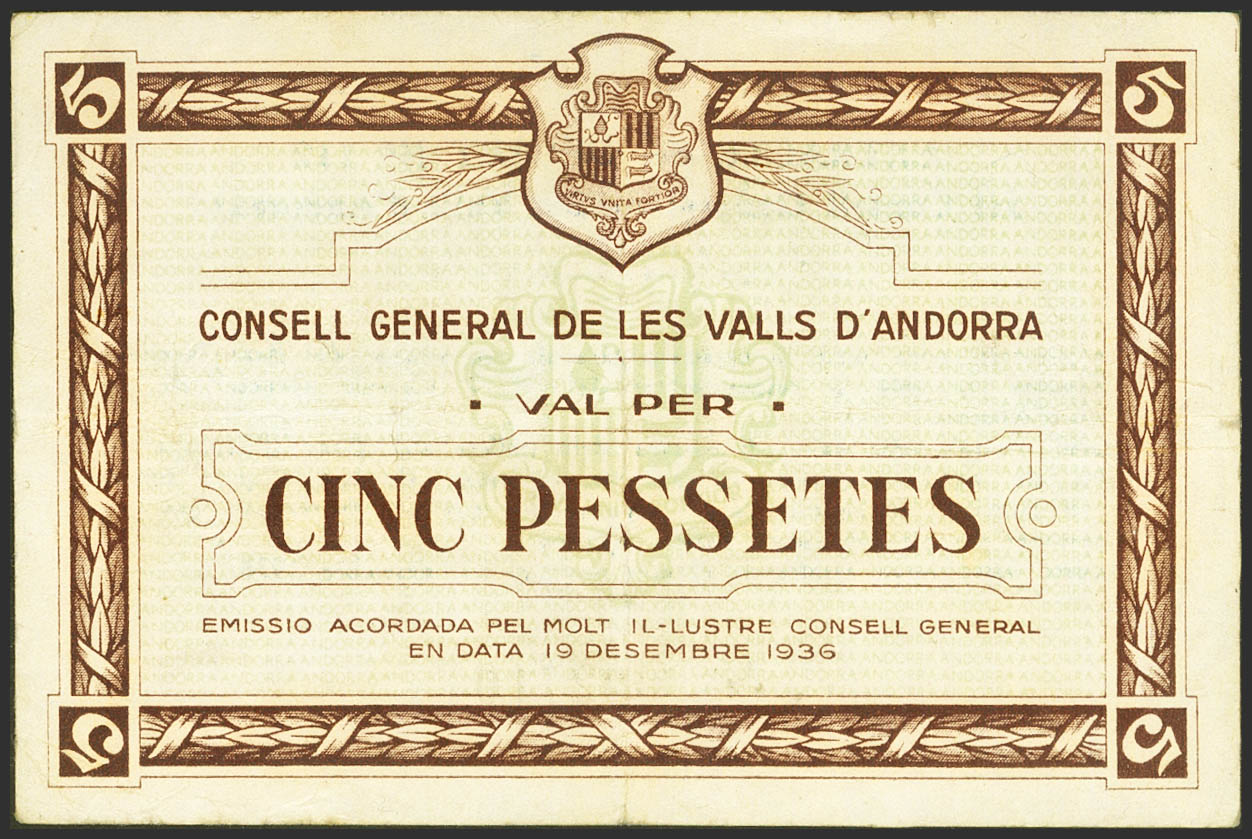 ANDORRA. 5 Pessetes. December 19, 1936. (Edifil 2021: 7, Pick: 8). Rare. Good Very Fine.