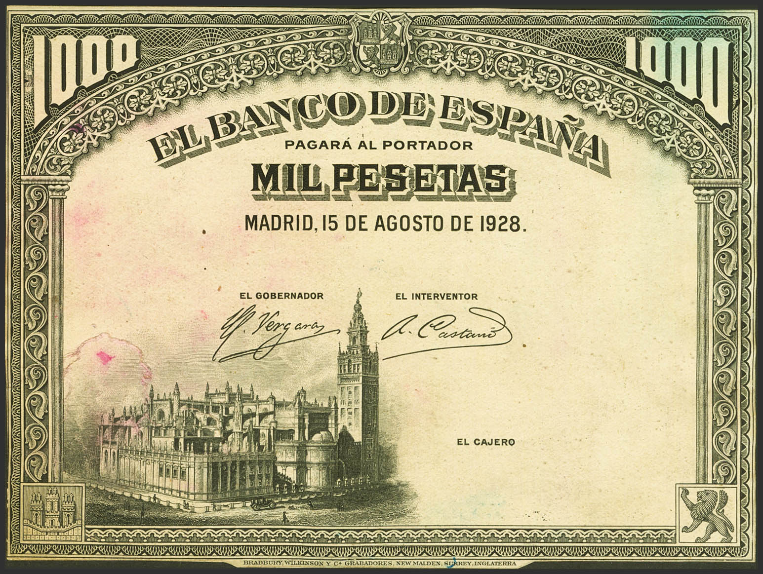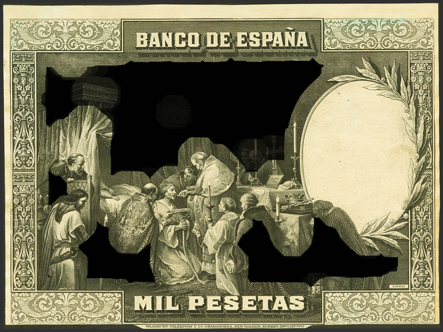 Proof of the front and back in black (adhered together) and without margins of the 1000 Pesetas bill issued on August 15, 1928, without numbering (Filabo: 140p). Very rare. Extremely Fine. It coincides with the one photographed in the Filabo catalogue, so we deduce that it is the only test of this type known to date.