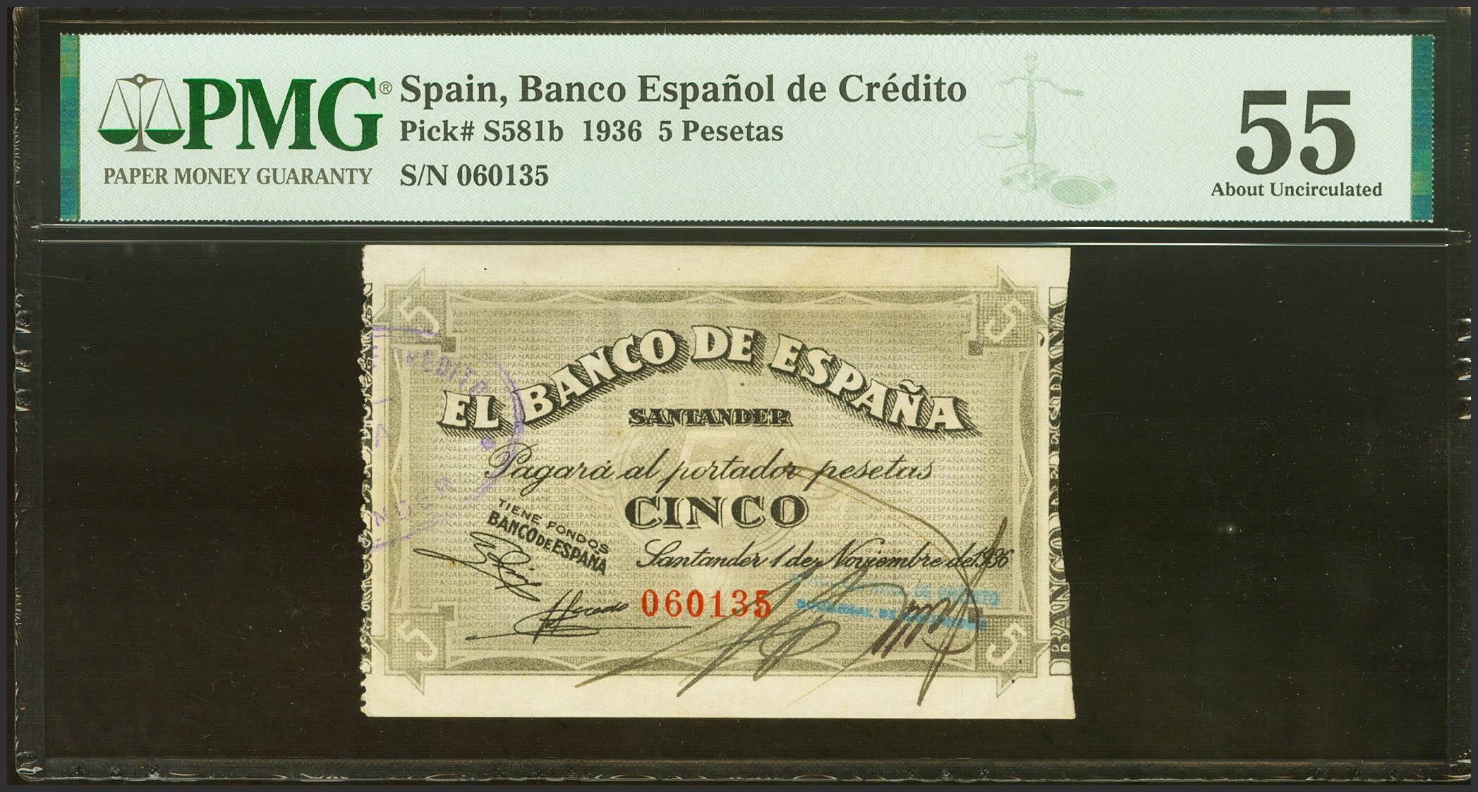 5 Pesetas. November 1, 1936. Santander Branch, presignature of the Spanish Credit Bank. No serie. (Edifil 2021: 375b, Pick: S581b). Very rare in this exceptional quality. Good Extremely Fine. Encapsulated PMG55 (to give us an idea of the rarity, as of November 1, 2023, it is the highest graded bill in PMG).