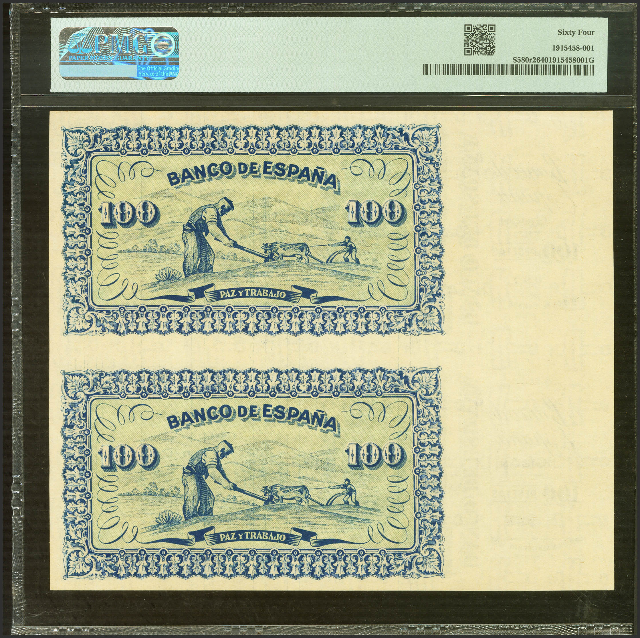 100 Pesetas. September 1937. Couple without guillotining. Without series, with numbering (applied later, like all known numbered copies) and with a matrix on the left. (Edifil 2021: 399b, Pick: S580r2). Uncirculated. PMG64 encapsulation.