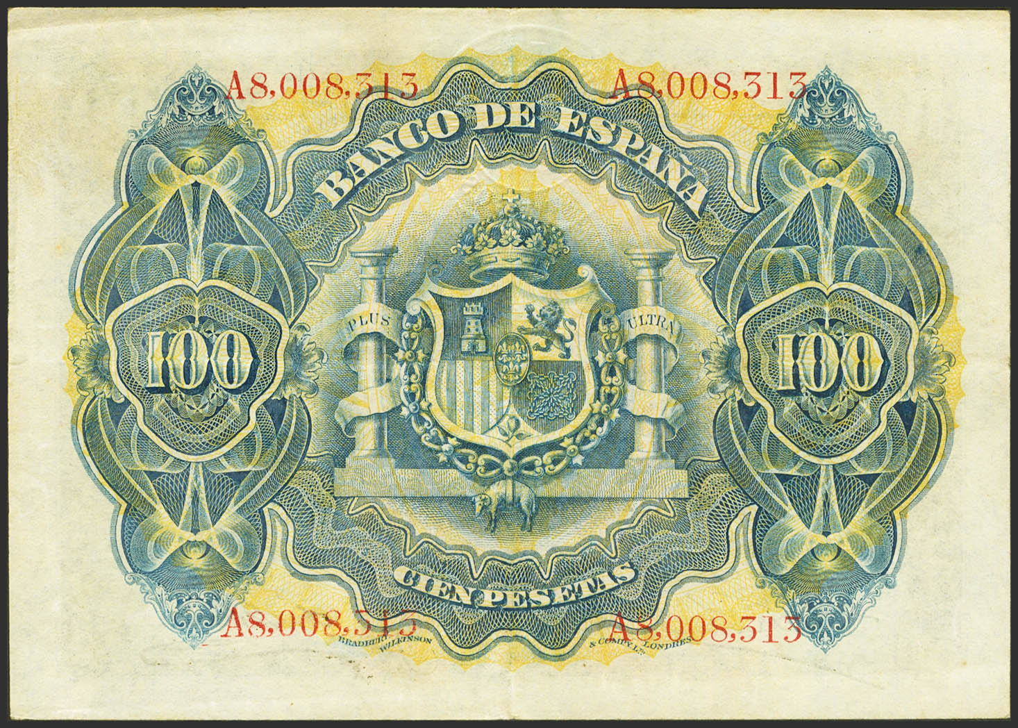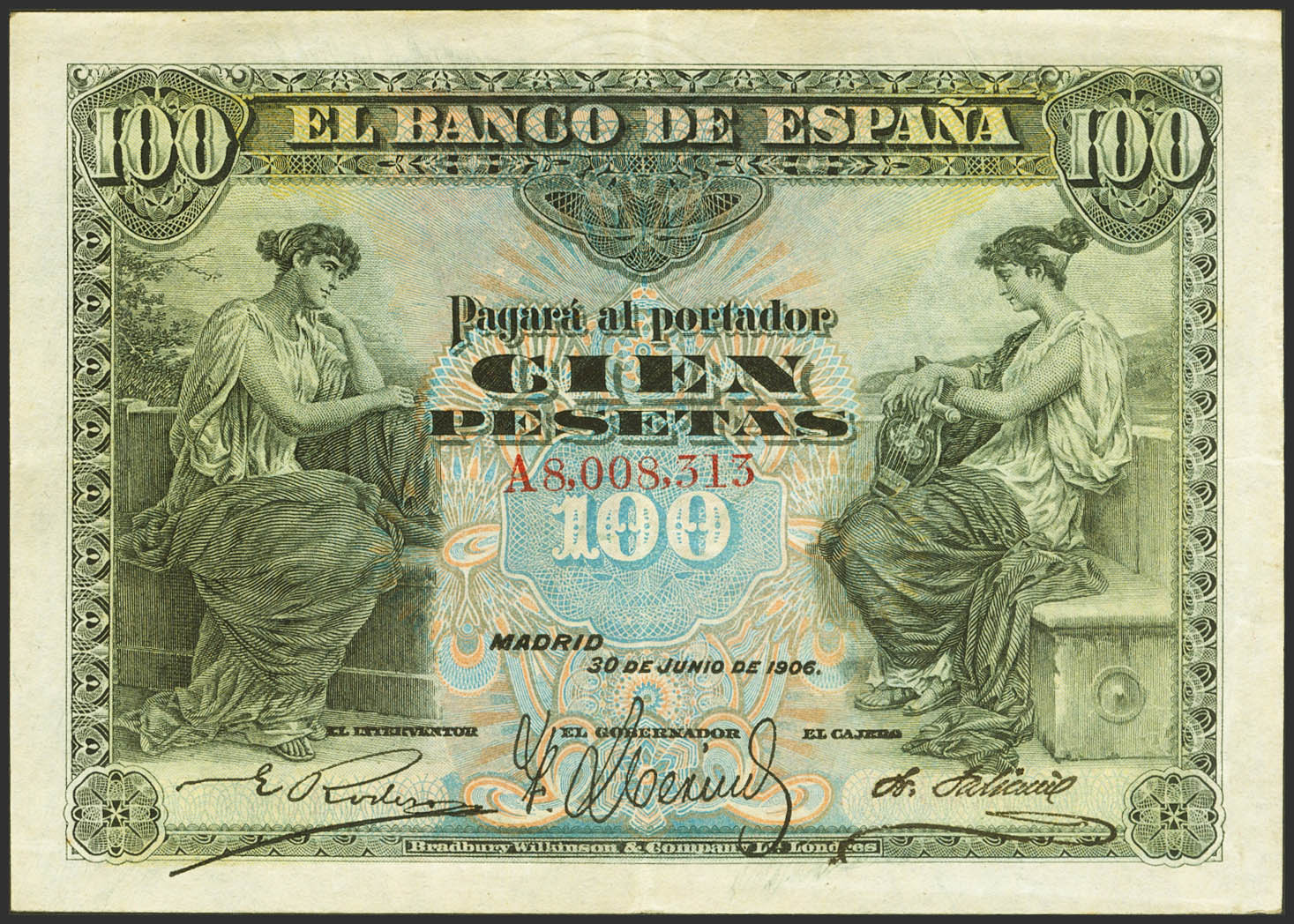 100 Pesetas. June 30, 1906. Series A and dry stamp SPANISH STATE / BURGOS. (Edifil 2021: 408). Very Fine.
