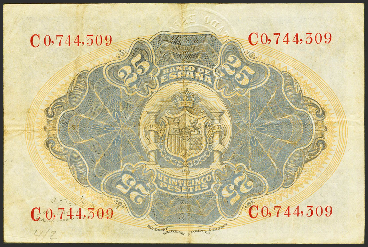 English 25 Pesetas. September 24, 1906. Series C and with the SPANISH STATE / BURGOS seal. (Edifil 2021: 400). Very Fine.