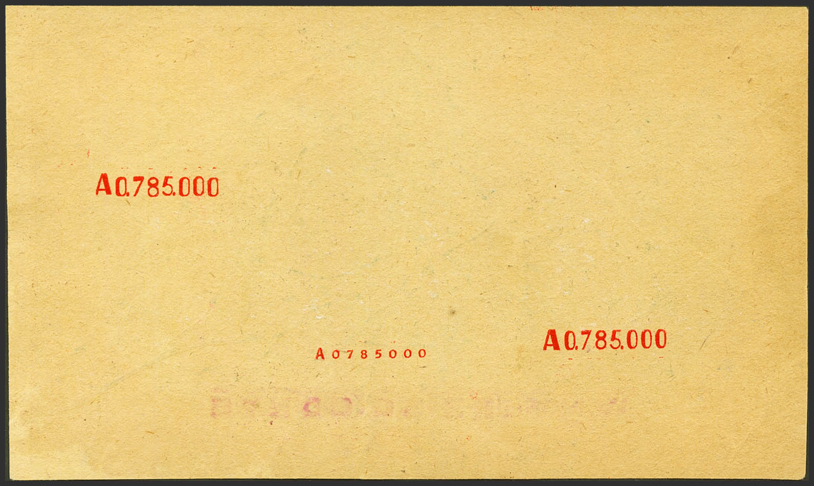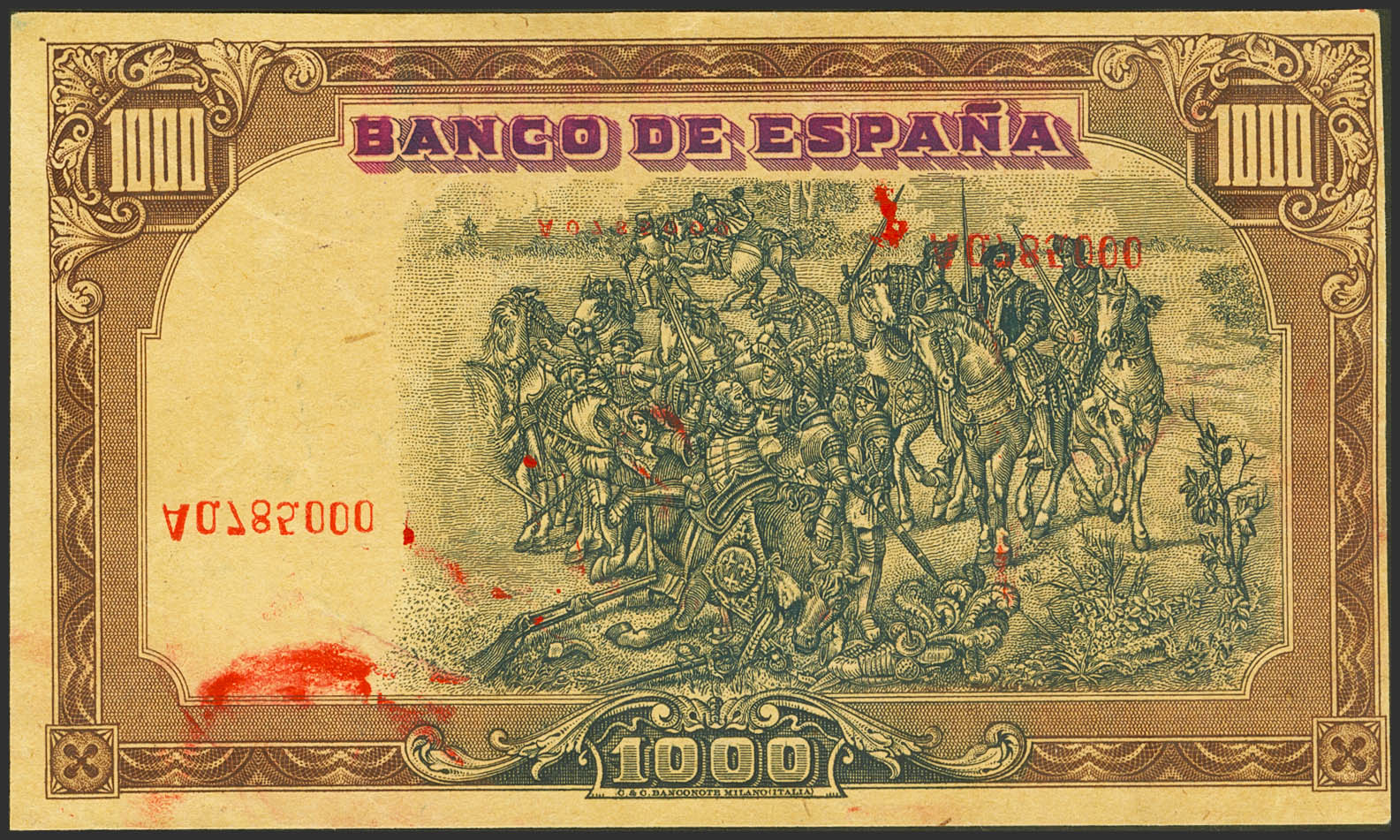 Proof of the reverse of 1000 Pesetas Not Issued, dated 1937 and with the Cartevalori numbering, added in a later process. (Filabo: NE24pb, Ne24pv). Rare. Almost Extremely Fine.