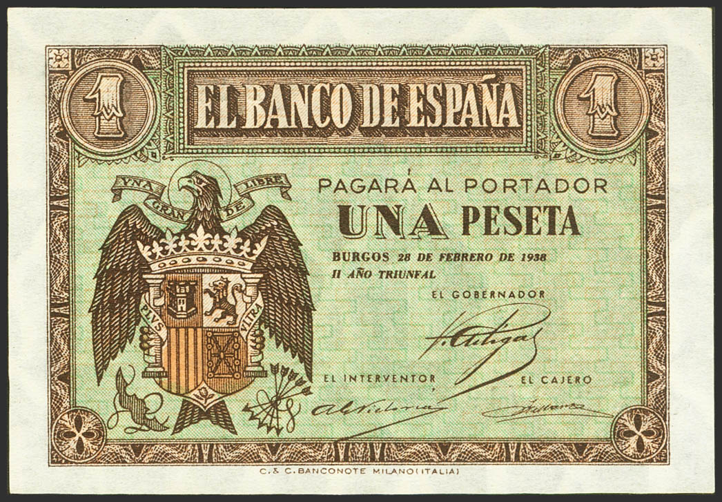 English 1 Peseta. February 28, 1938. Series B. (Edifil 2021: 427a, Pick: 107a). Original sizing. Uncirculated.
