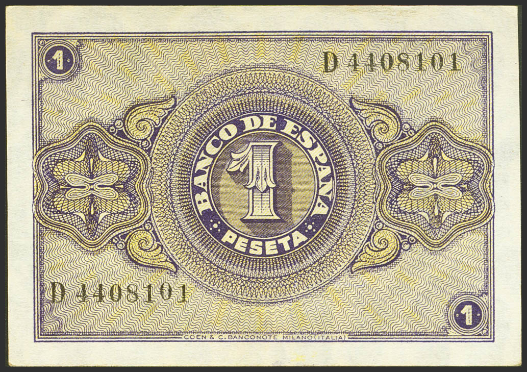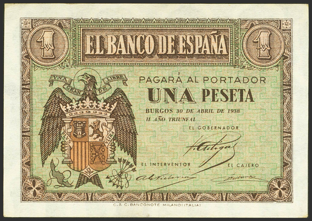 1 Peseta. April 30, 1938. Series D. (Edifil 2021: 428a, Pick: 108a). Original sizing. Almost Uncirculated.