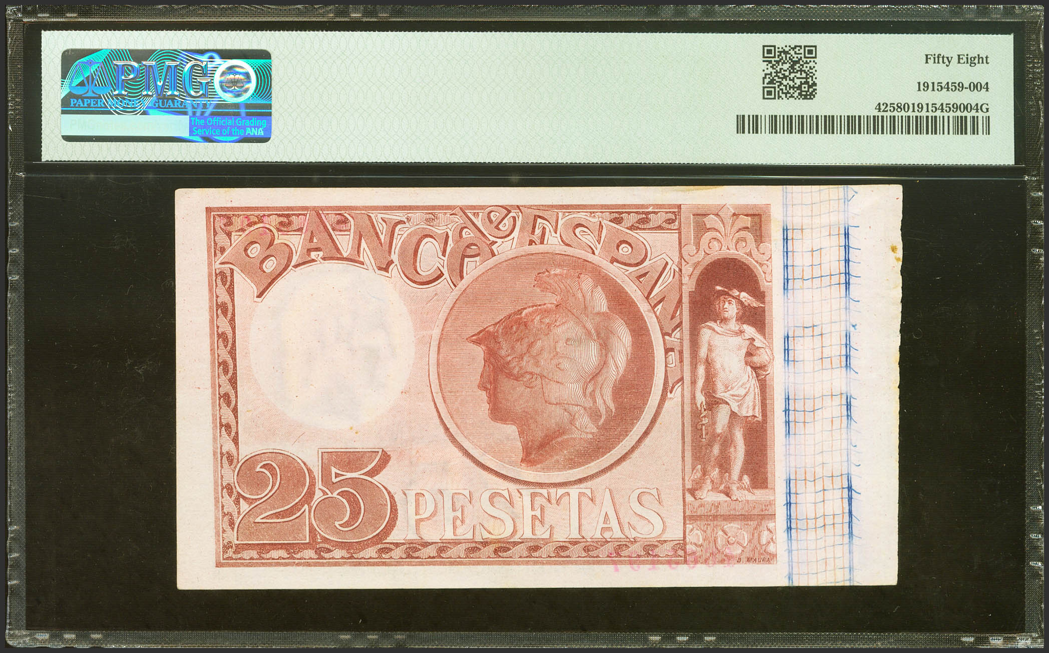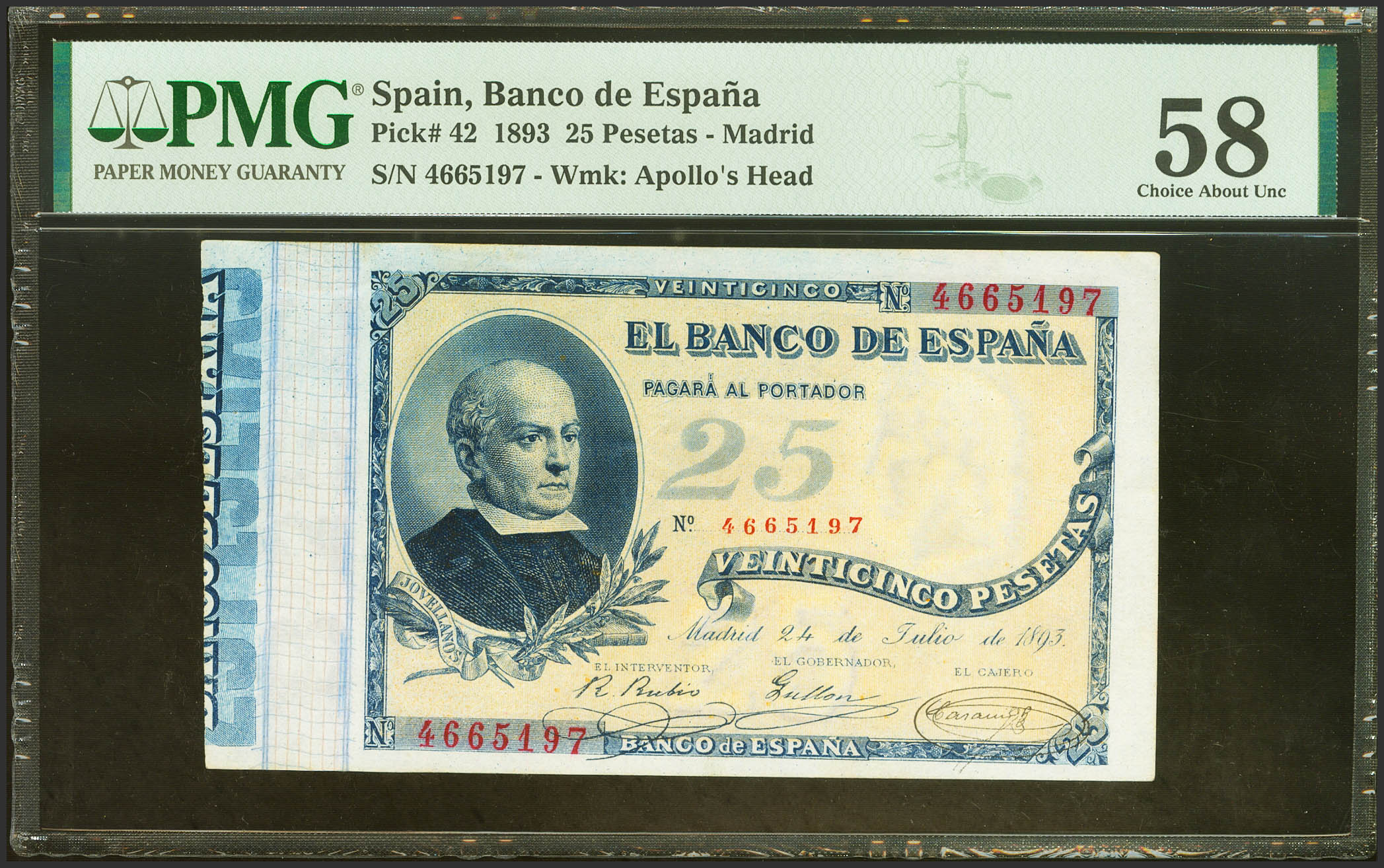 25 Pesetas. July 24, 1893. No series. (Edifil 2021: 300, Pick: 42). Rare especially in this exceptional quality and without any repair, almost correlative numbering with the one photographed in the Filabo catalogue. EBC++. Encapsulated PMG58 (to give us an idea of the rarity, as of November 1, 2023, it is the highest graded bill in PMG).