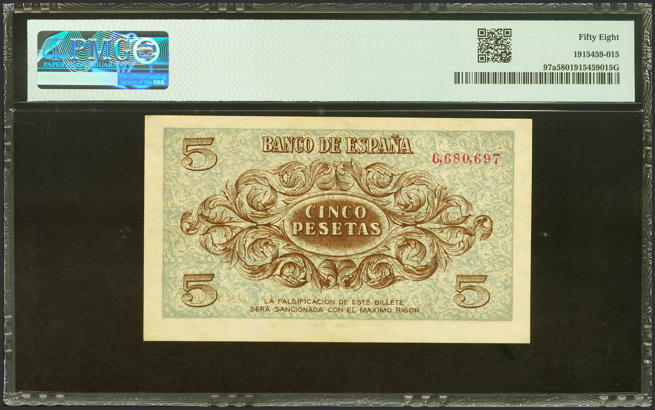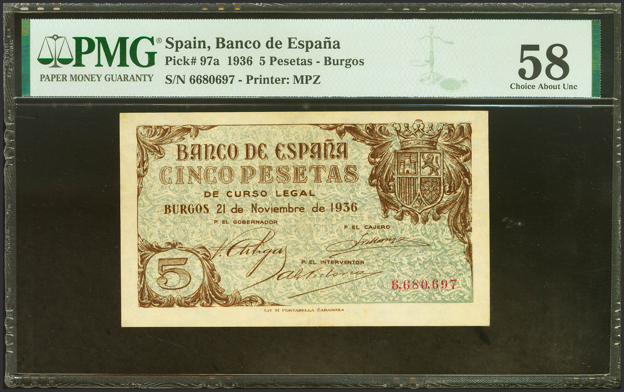 5 Pesetas. November 21, 1936. No series. (Edifil 2021: 417, Pick: 97a). Very rare in this conservation. EBC++. PMG58 encapsulation.