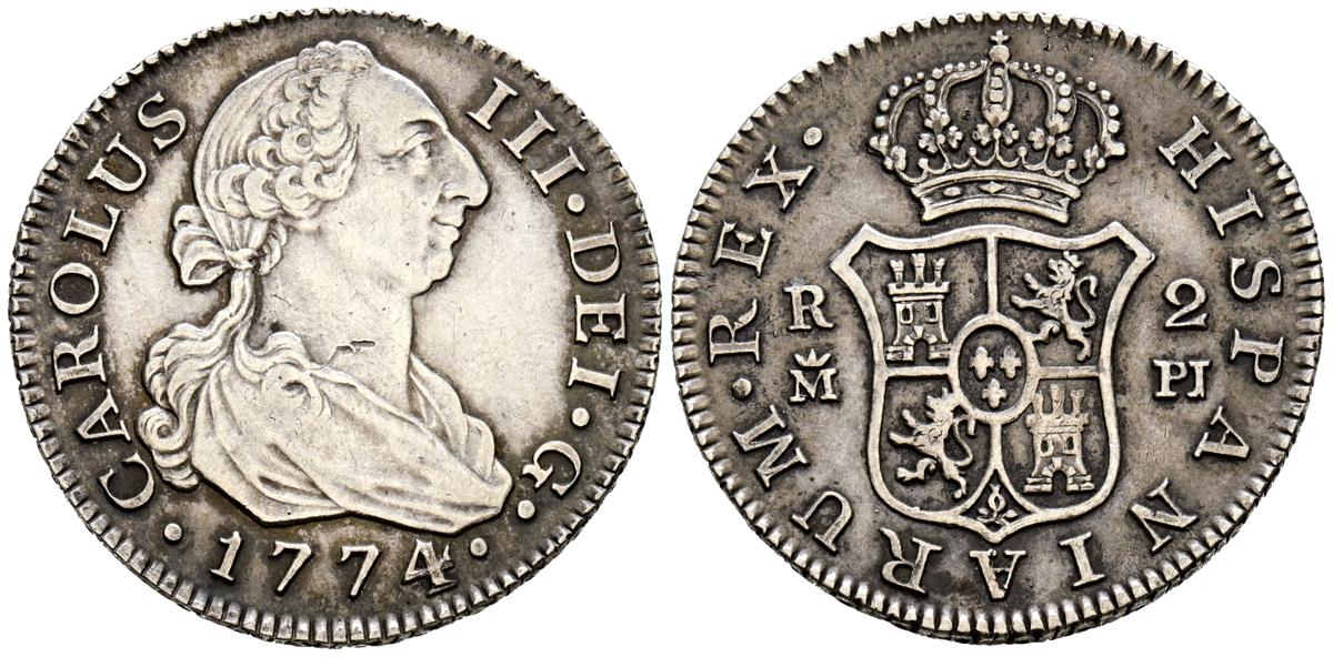 English CARLOS III (1759-1788). 2 Reales. (Ar. 5.91g/27mm). 1774. Madrid PJ. (Cal-2019-623). Good Very Fine. Cleaned.